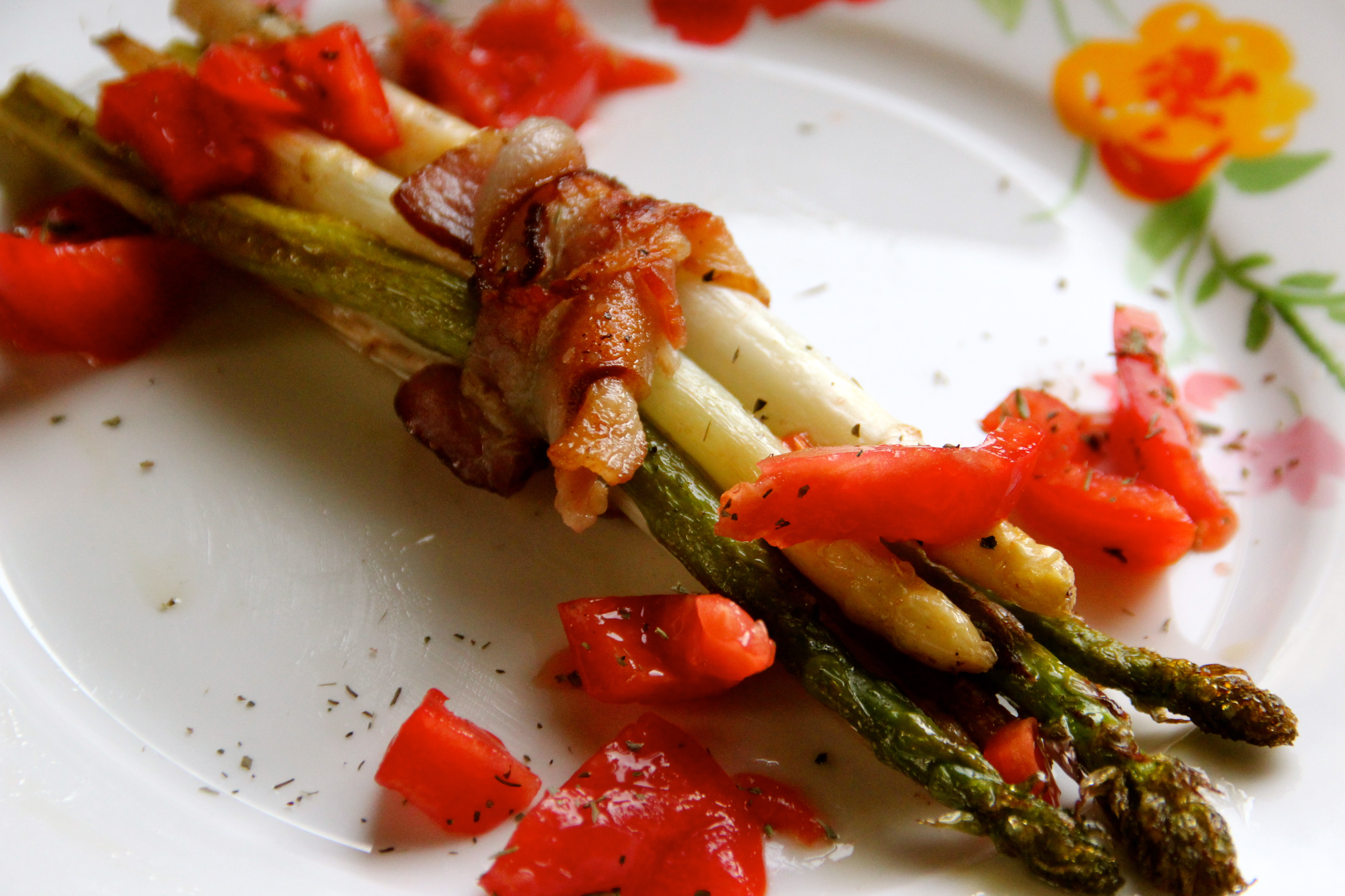 La Methode: Use a vegetable peeler to peel the last 1/4 end of asparagus and cut off the very ends. Dice a medium tomato, removing seeds first and drizzle with truffle oil, sprinkle lightly with salt and pepper and toss until mixed well. Fry 4 slices of bacon until crisp, reserve fat in pan and crumble bacon. Add 2 tablespoons of butter and 2 tablespoons of extra-virgin olive oil to melted bacon fat in a 12″ skillet. Heat on a low to medium heat and add asparagus. Cook until slightly golden brown. Tie one piece of bacon around a bundle of 2 white, two green asparagus spears. Return bundled spears back to pan and cook bacon tied around spear, turning it as it browns. Plate spears and sprinkle with crumbled bacon and garnish with diced tomatoes. Fantastique!