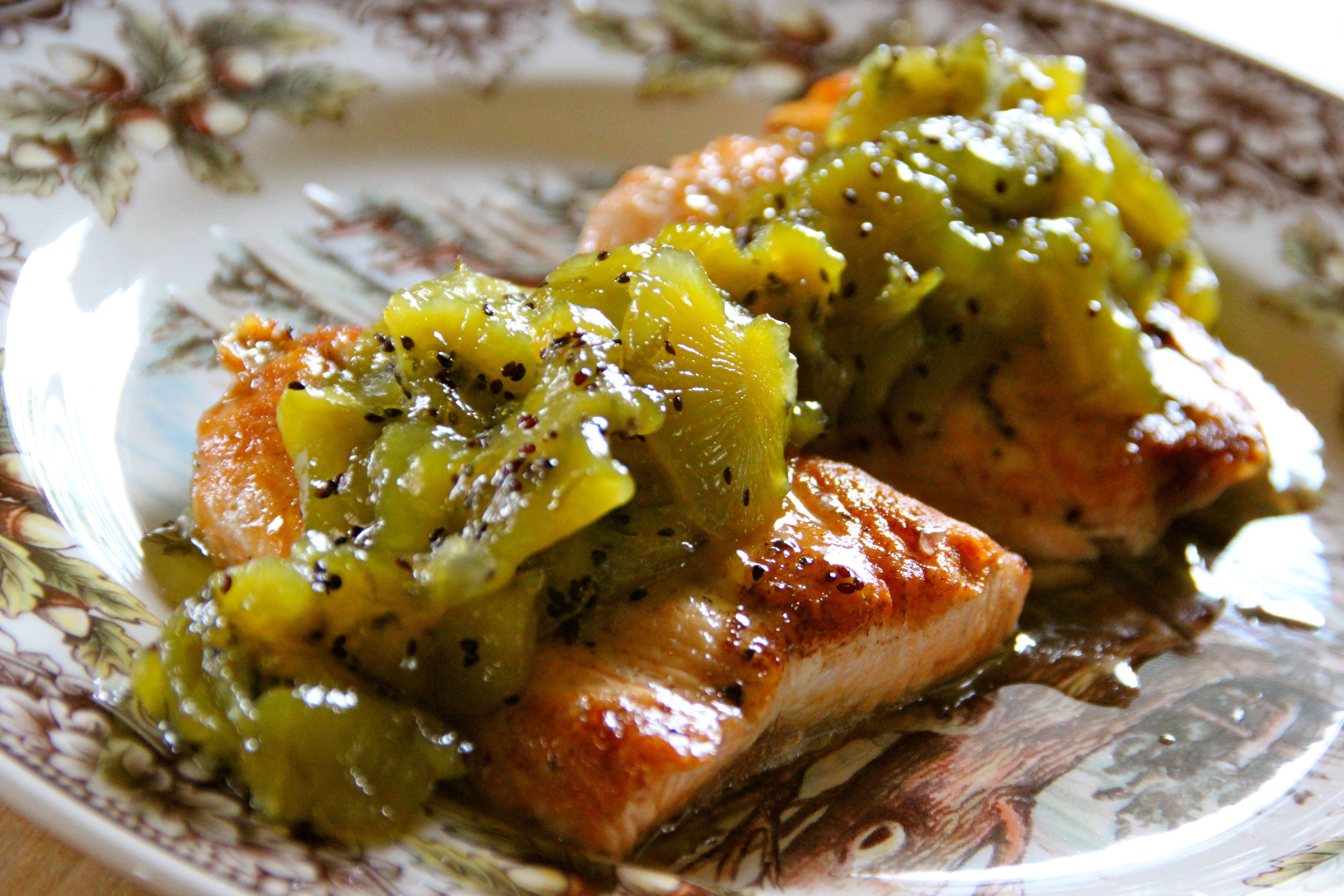 Recipe is for 4 people. Add one fillet per person for more servings and increase sauce components by 1/4 per extra serving. 3 kiwis, peeled and cut into slices 1/4 cup of water Zest and juice of one lime 1 heaping tablespoon of honey 2 tablespoons of butter 4 fillets of salmon Pinch of salt and fresh cracked pepper