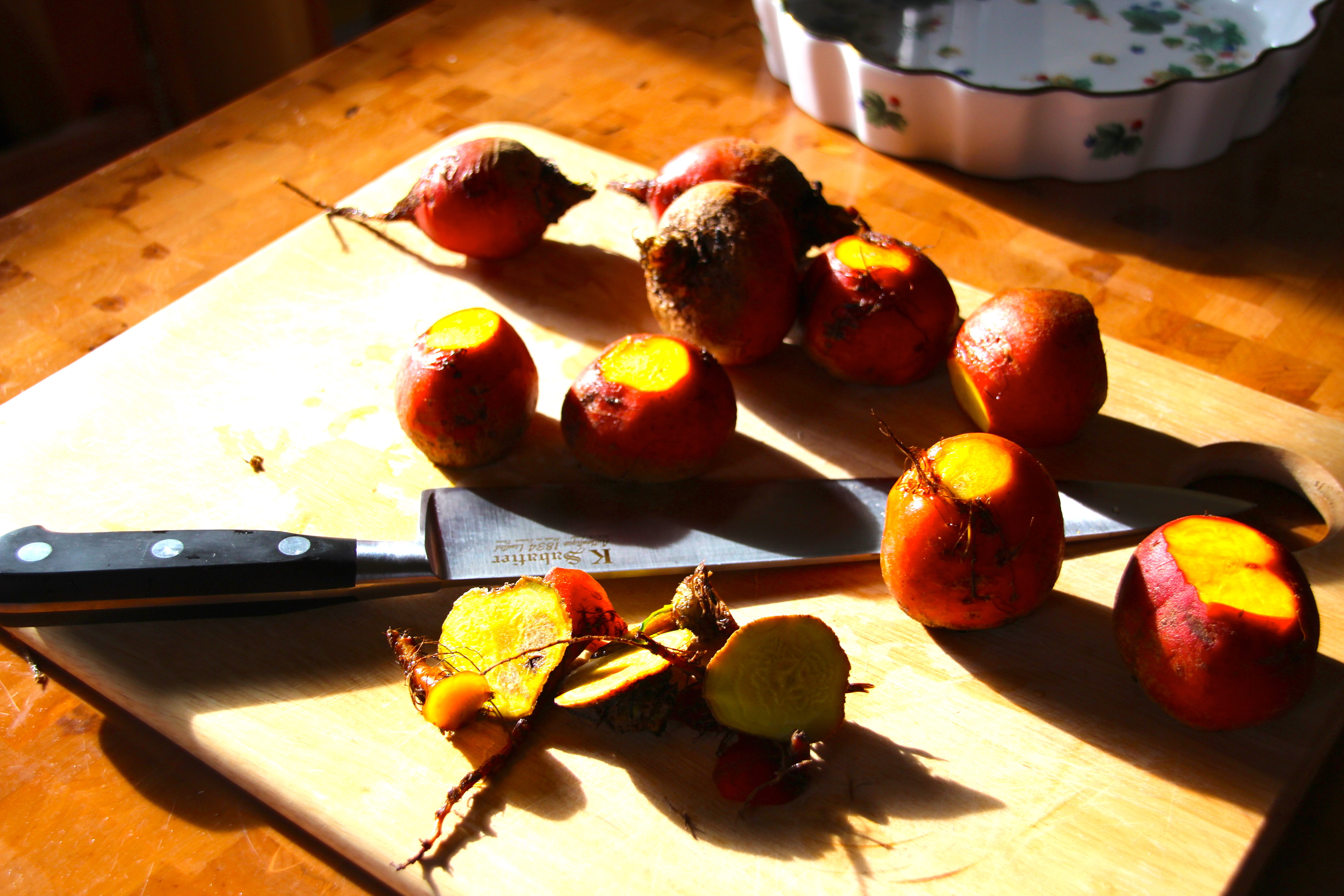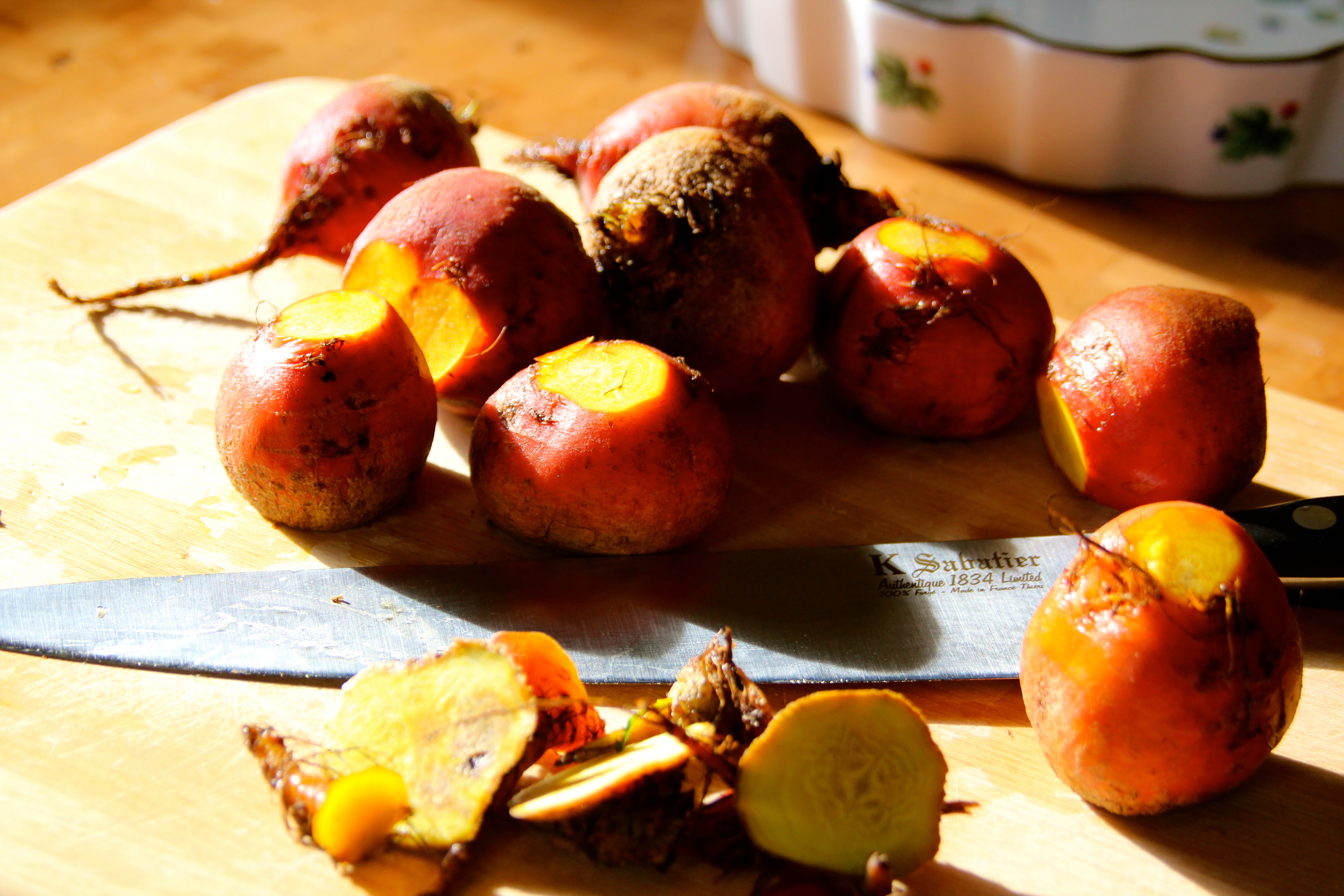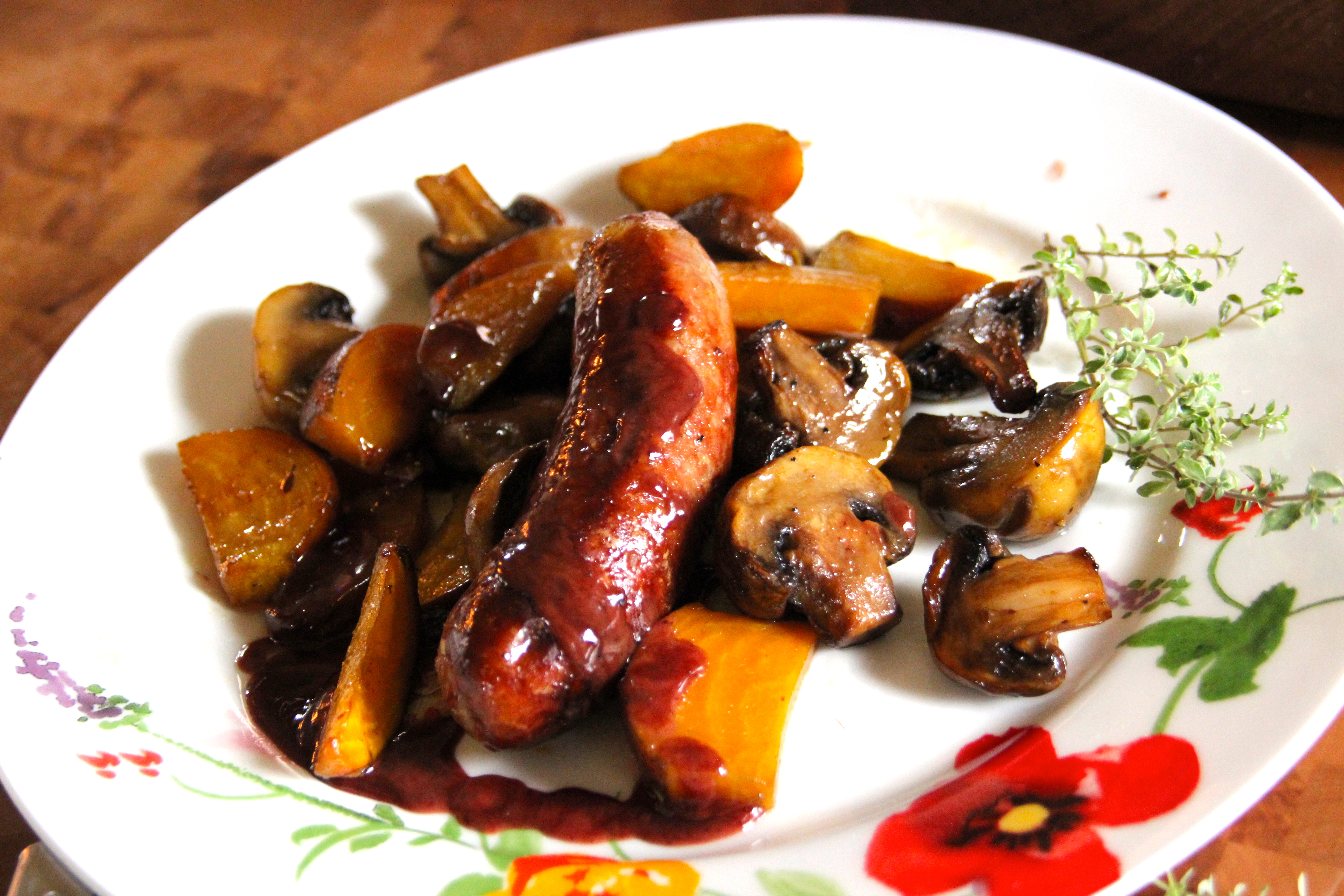 Fresh yellow beets are baked with fragrant, juicy mushrooms and roasted bratwurst in a glorious mid winter’s meal that will please and comfort the hearts and souls of those that live in the Alsace-Lorraine region of France. Prepare this simple peasant food dish and be transported to another time and place when food was made with love and the flavours were unmatched.