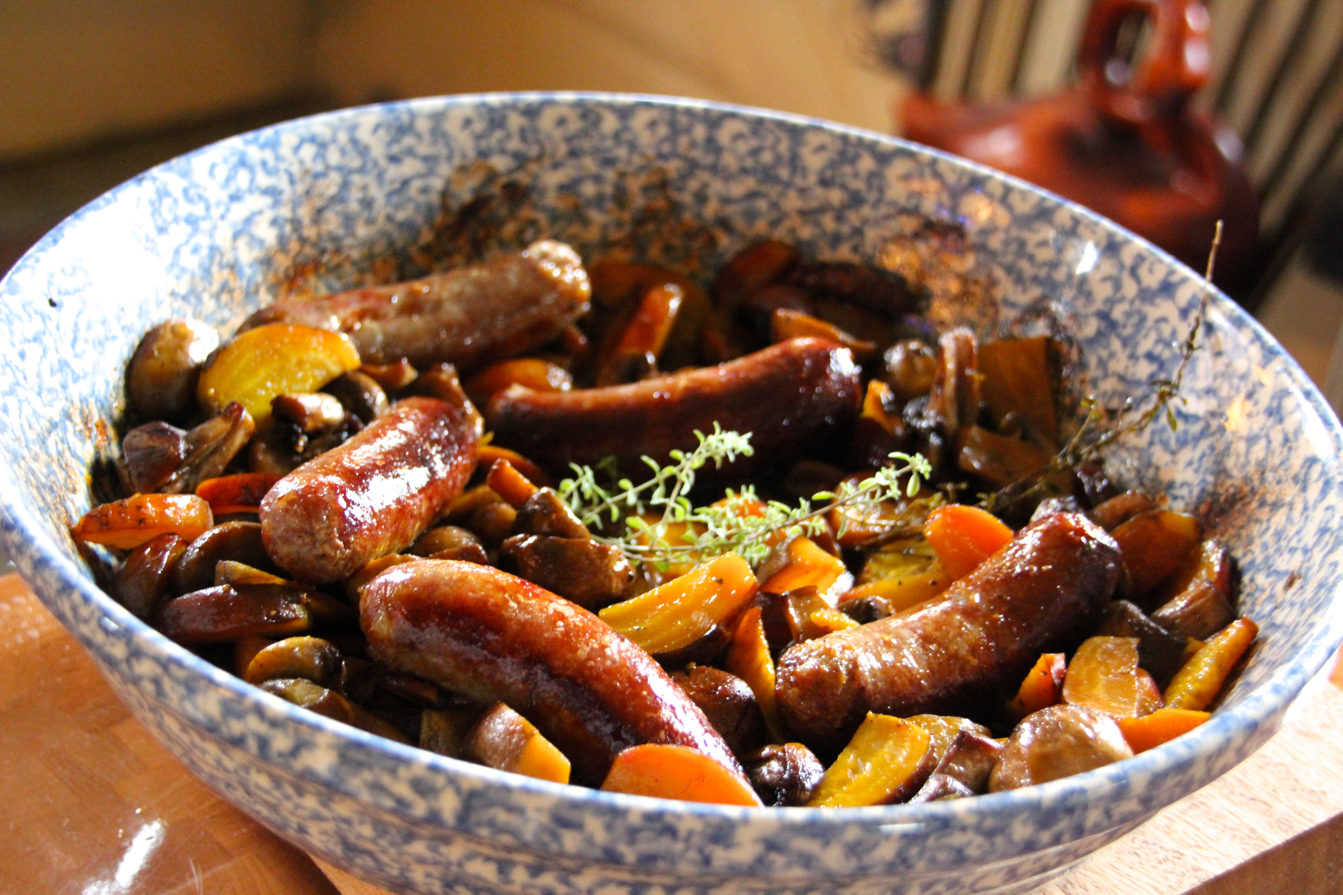Place in a large baking dish and cook for 1 hour, tossing ingredients every 20 minutes. Add the sausage half way through the baking time if you browned them, otherwise put them in at the very beginning.