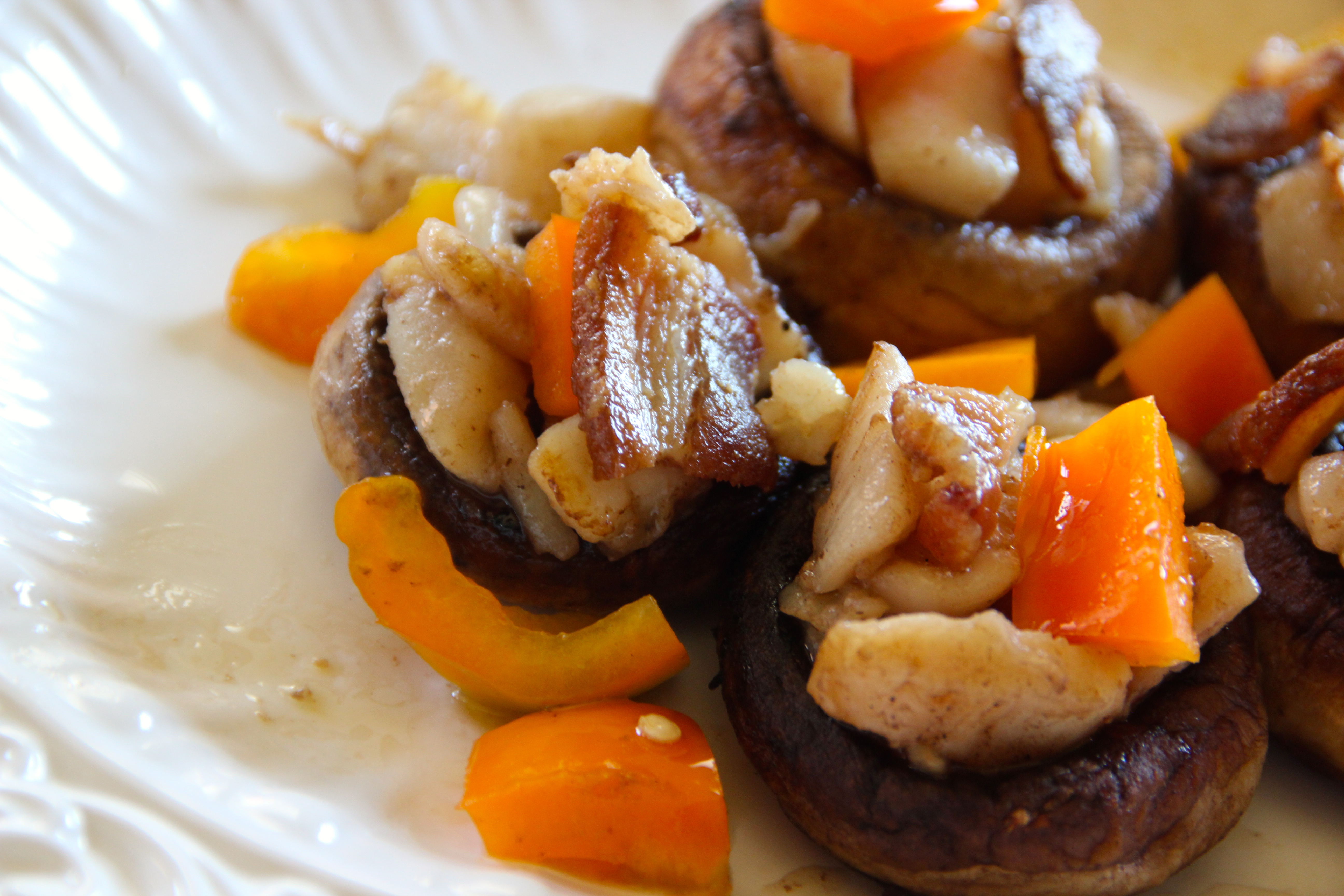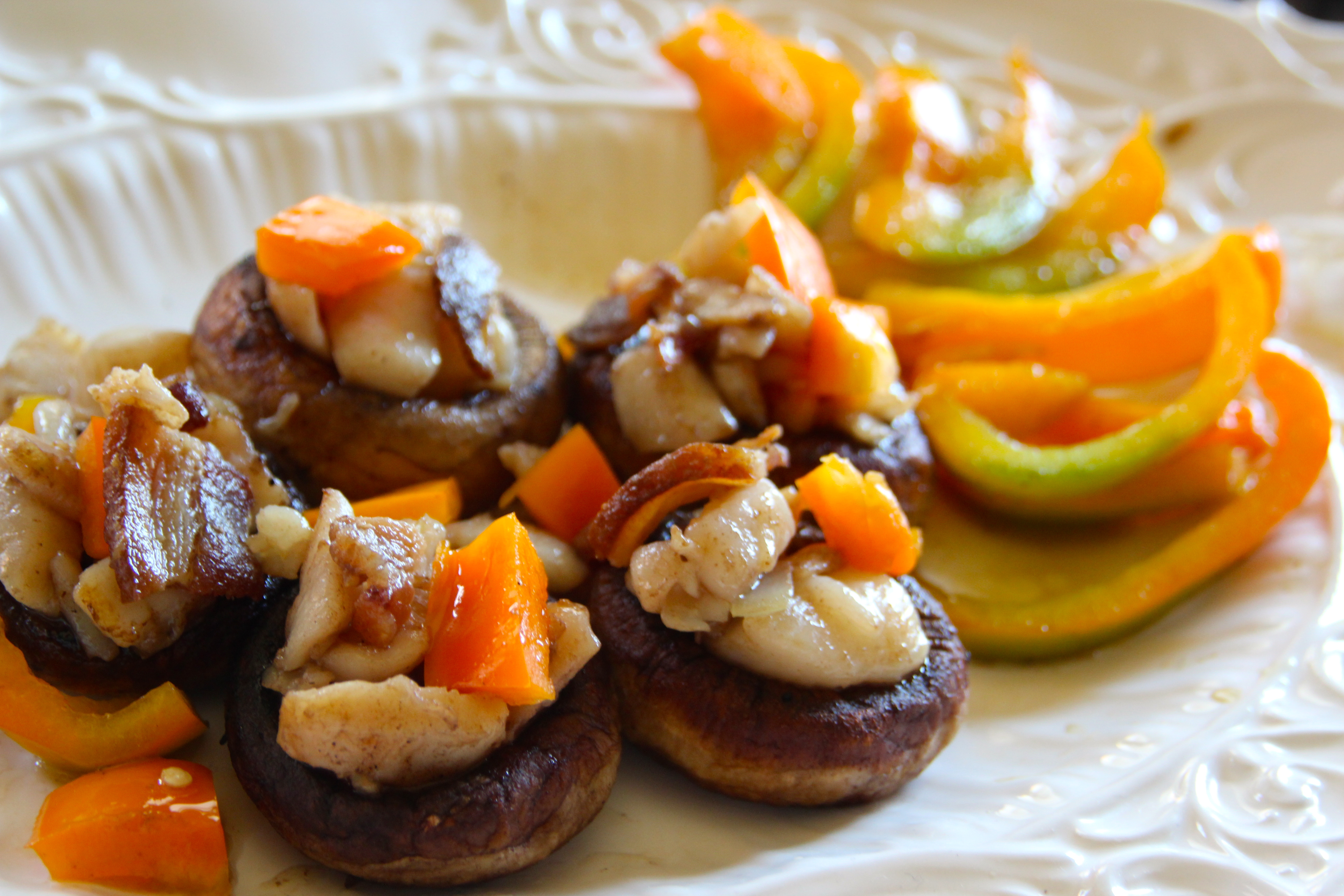 2-3 large mushrooms per person (stems carefully removed) 1 lb of scallops, chopped slightly into pieces. One large shallot, chopped fine Sea salt and Fresh ground pepper Butter and extra-virgin olive oil 1/2 of a orange sweet pepper, half diced, half of it cut into slivers 2 slices of bacon, pre-cooked and chopped