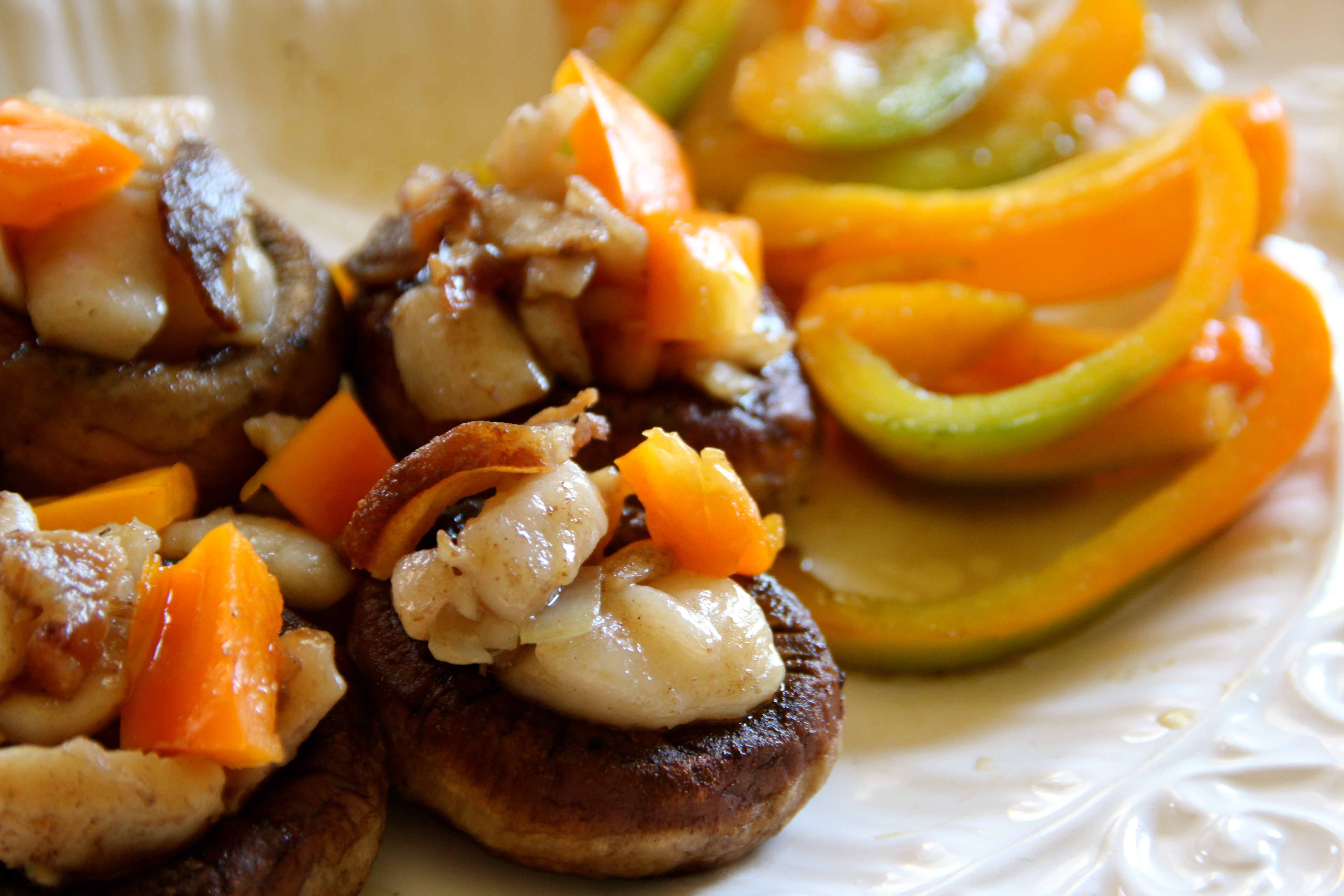 Place one tablespoon each of oil and butter and heat over a low to medium fire in a large skillet. Add chopped shallot and pepper. Cook, stirring occasionally until slightly browned. Remove from heat and place in a bowl in a warmed oven. Add mushrooms to the same pan with one more tablespoon each of oil and butter, cooking over low to medium heat. Brown both sides, about 8 minutes total time. Remove and place on a warm platter. Place scallops in the same pan with the remaining juice from the mushrooms. Add a pinch of salt and pepper and cook over a high heat, stirring occasionally. Remove from pan after 2 minutes and place in the center of the mushrooms. Top with the shallot and peppers and pan juices from the scallops. Top with diced bacon. Garnish plate with pepper slivers. Voila!!