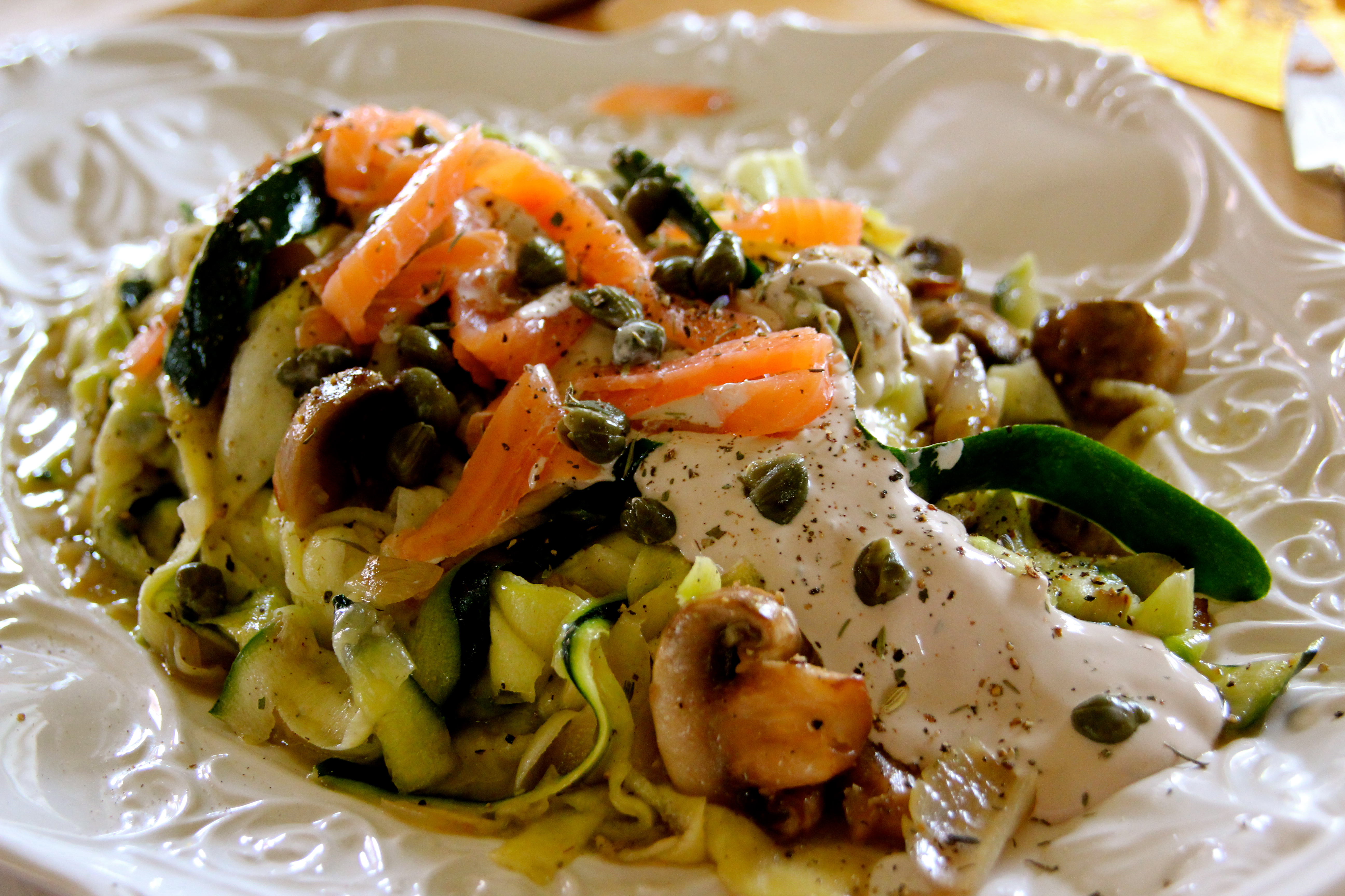 1. Chop shallots and sauté with two tablespoons of butter until translucent. Add quartered mushrooms with a pinch of salt and fresh cracked pepper. Sauté another 5 minutes and turn off heat. 2. Make sauce by combining balsamic vinegar and sour cream. Add more or less vinegar to taste. 3. Use vegetable peeler to make ribbons of the zucchini and stop when you get to the seeds (see video). Toss with a several tablespoons of extra virgin olive oil, pinch of salt, fresh ground pepper and Herbs De Province (optional). 4. Combine all vegetables, mix well and arrange on a nice platter. 5. Top with a bit of the sauce for decoration, but reserve the majority for individual plates. 5. Garnish with strips of smoked salmon and capers. You can further garnish with more Herbs De Province and fresh cracked pepper if desired.