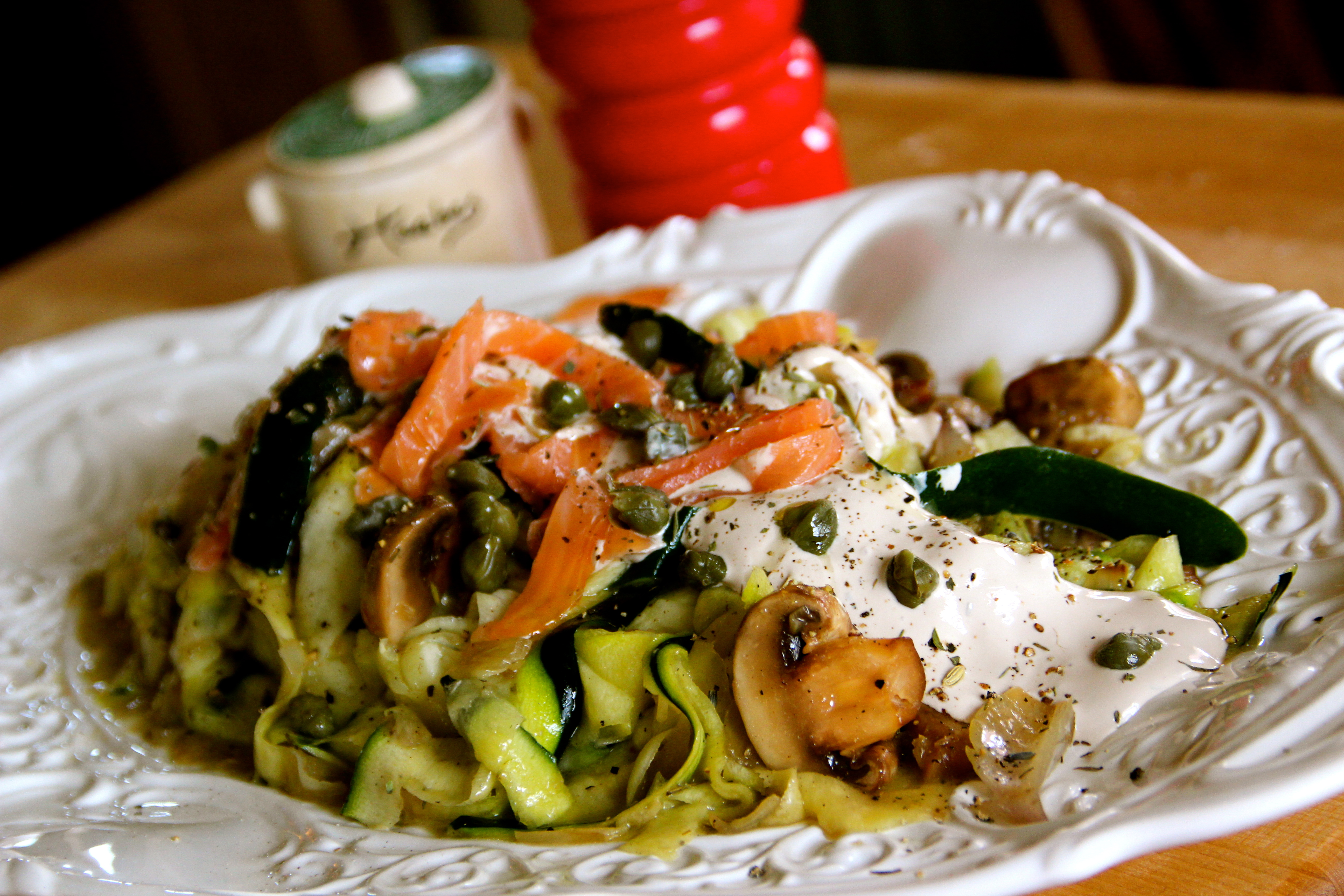 Vibrant and light vegetable spring time meals are necessary to help shake off the the winter like this fantastic combination of flavours and textures. Balsamic sour cream sauce tops ribbons of crisp zucchini and sautéed mushrooms with shallots. Add delicate ribbons of smoked salmon and capers for a boost of flavour, and a masterpiece is born in less than 30 minutes.