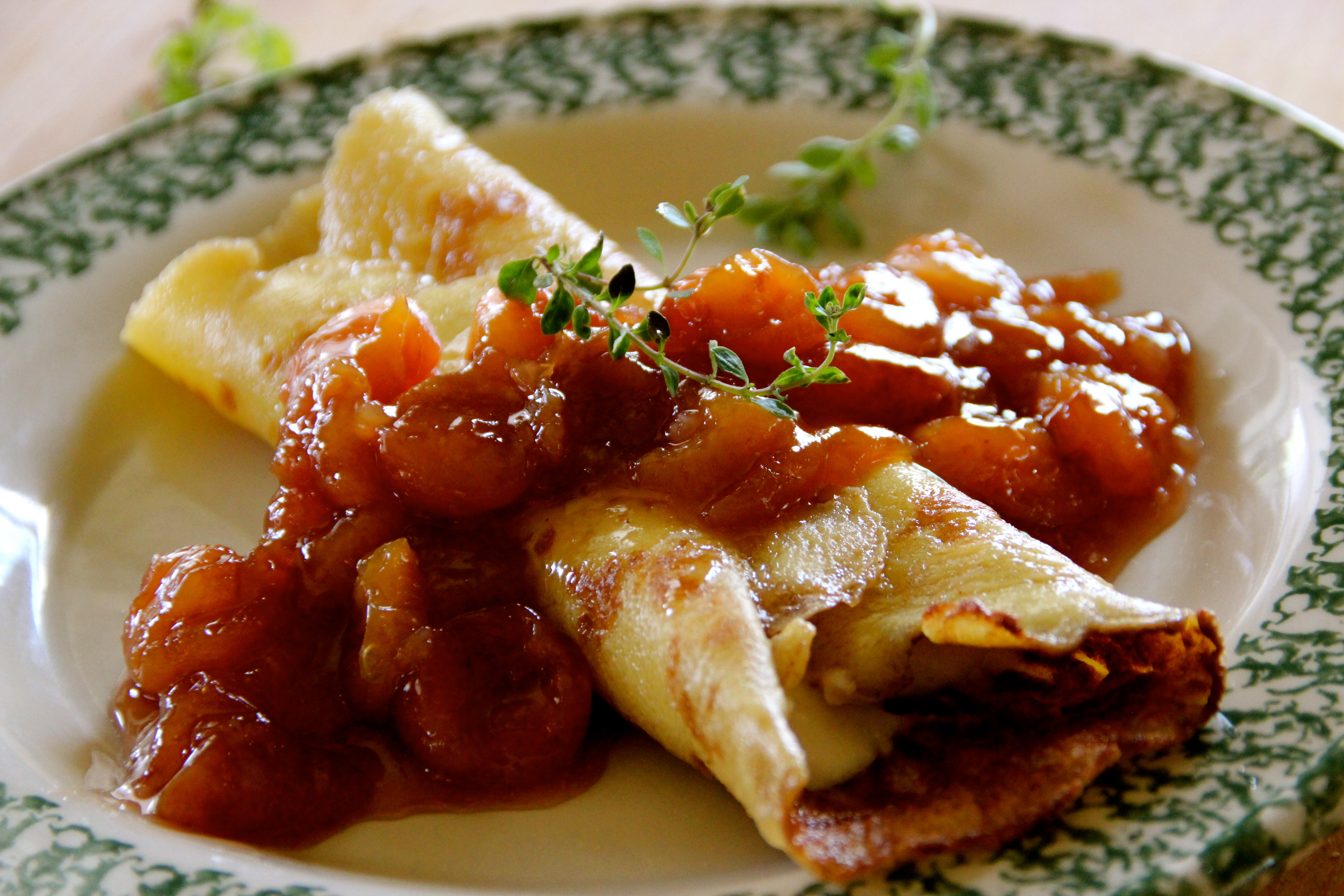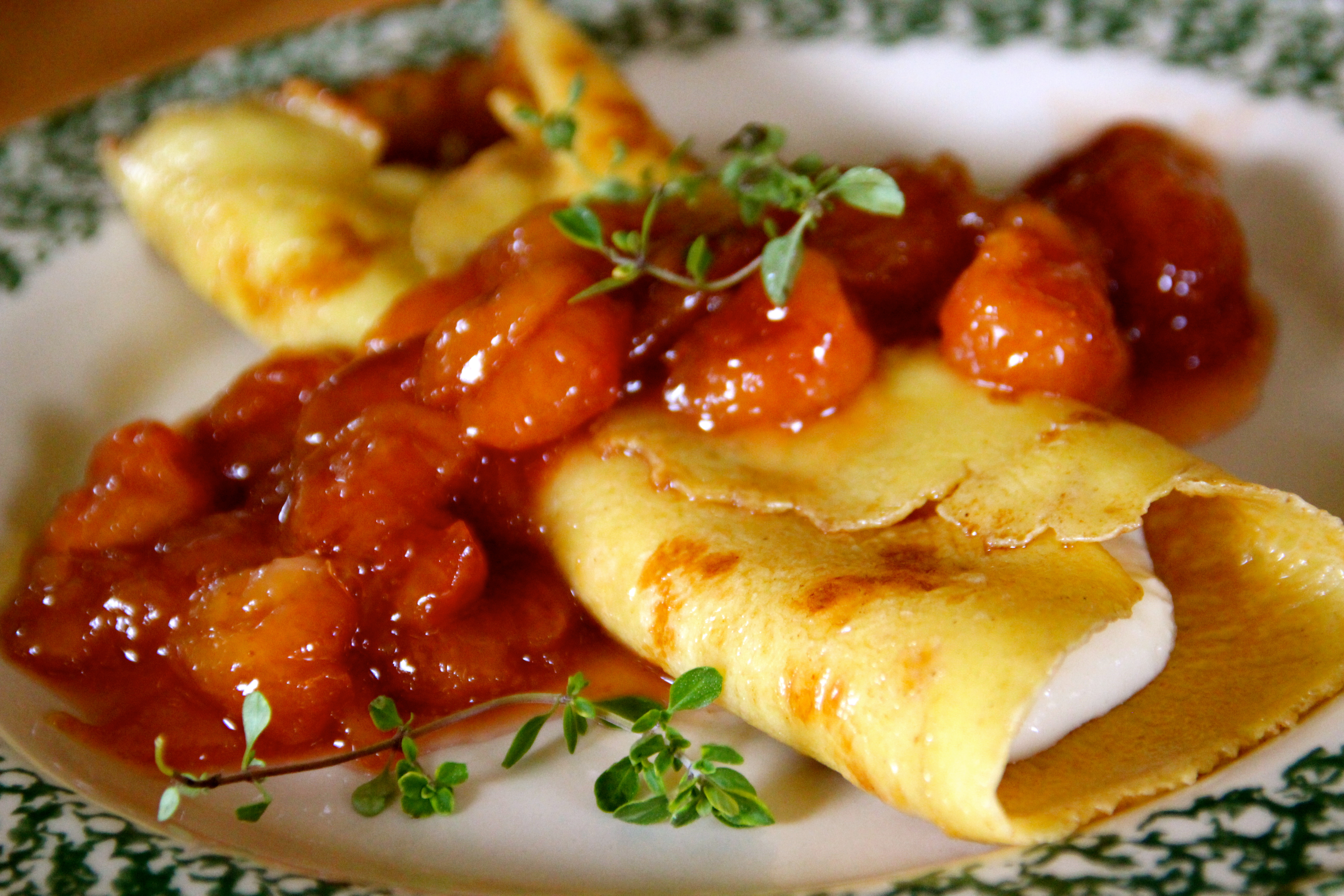 A dish is very near to my heart as it is one of my first memories of food from my mérère and mother making for me in their restaurants and in this antique French kitchen that I made this video in. The scents and aroma bring me back every time I prepare them. This recipe is truly a feast for your palate as delicate, sweet cherries are in a sauce toping a crêpe that is filled with a citrus sweet cream cheese filling. French comfort food at it’s finest for me.