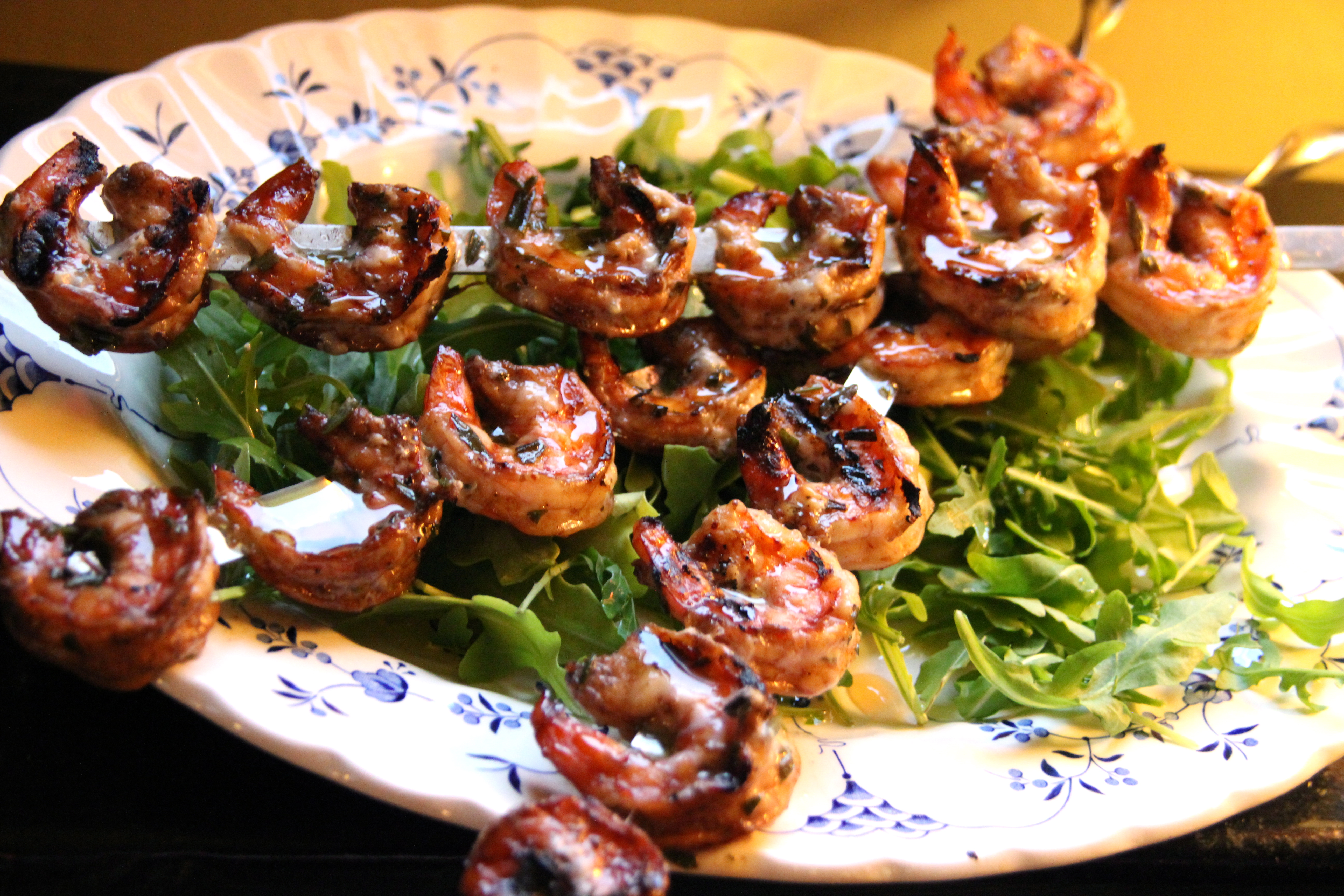 Place shrimp on skewers as shown in picture and cook on a high charcoal fire, cooking each side for about 2 minutes. Place on a bed of baby arugula and drizzle with extra virgin olive oil (I used truffle oil). Bon Apetite!!