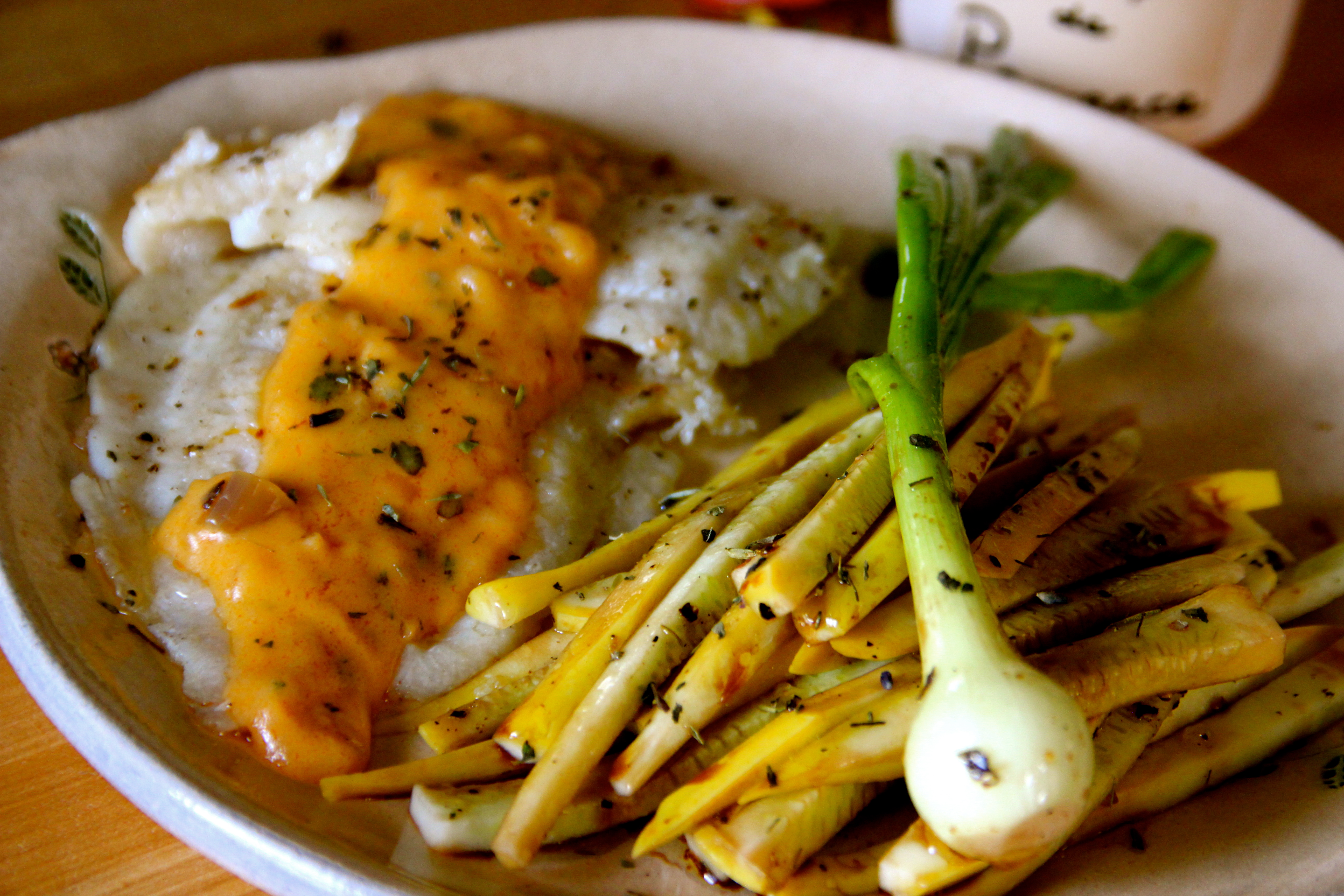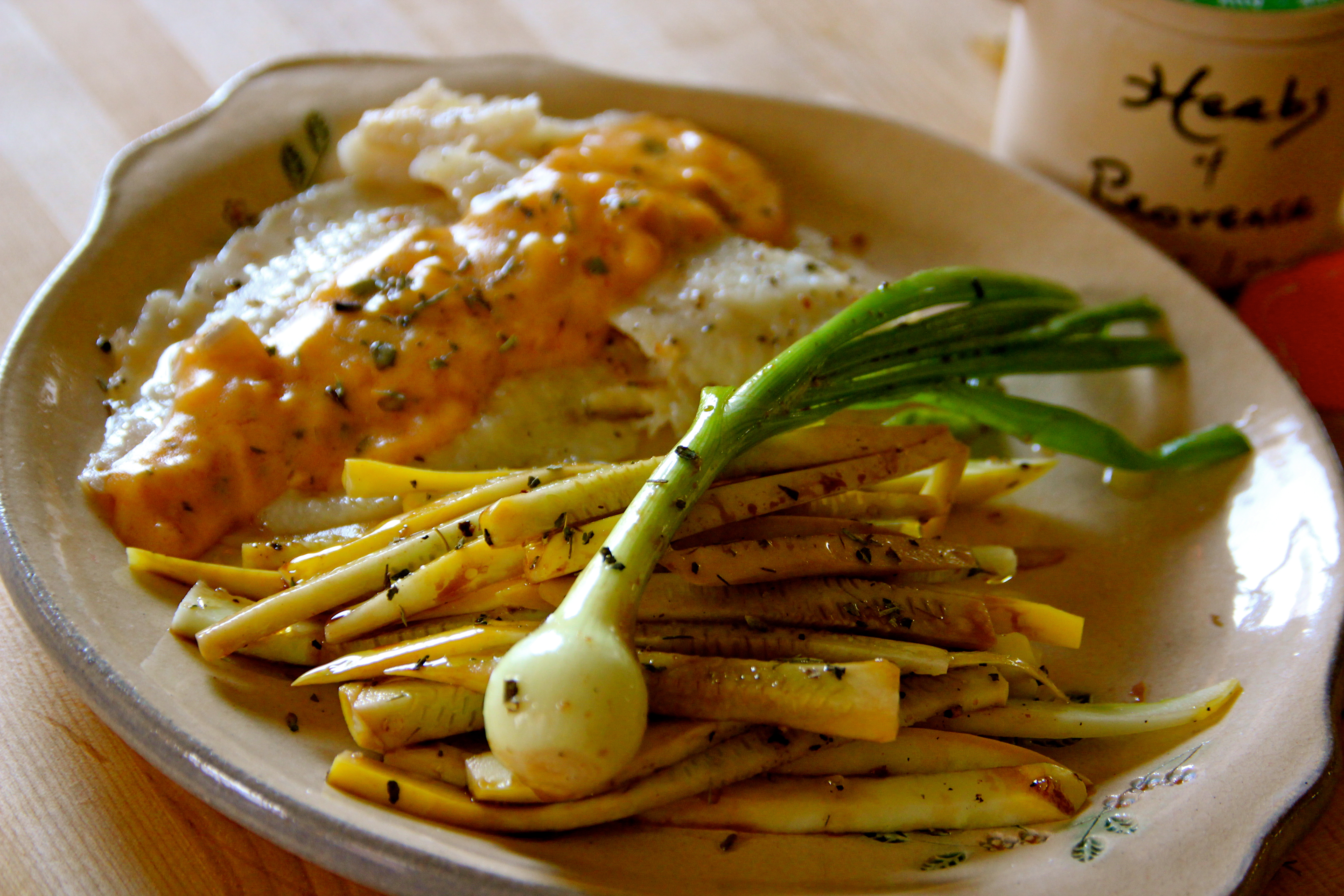An amazing seafood offering where delicate fillet of sole is topped with a velvety French sauce that has to be witnessed. Combine this with the fresh flavours of my garden vegetable recipe and perhasps a glass of champagne to make a complete gastronomique experience.