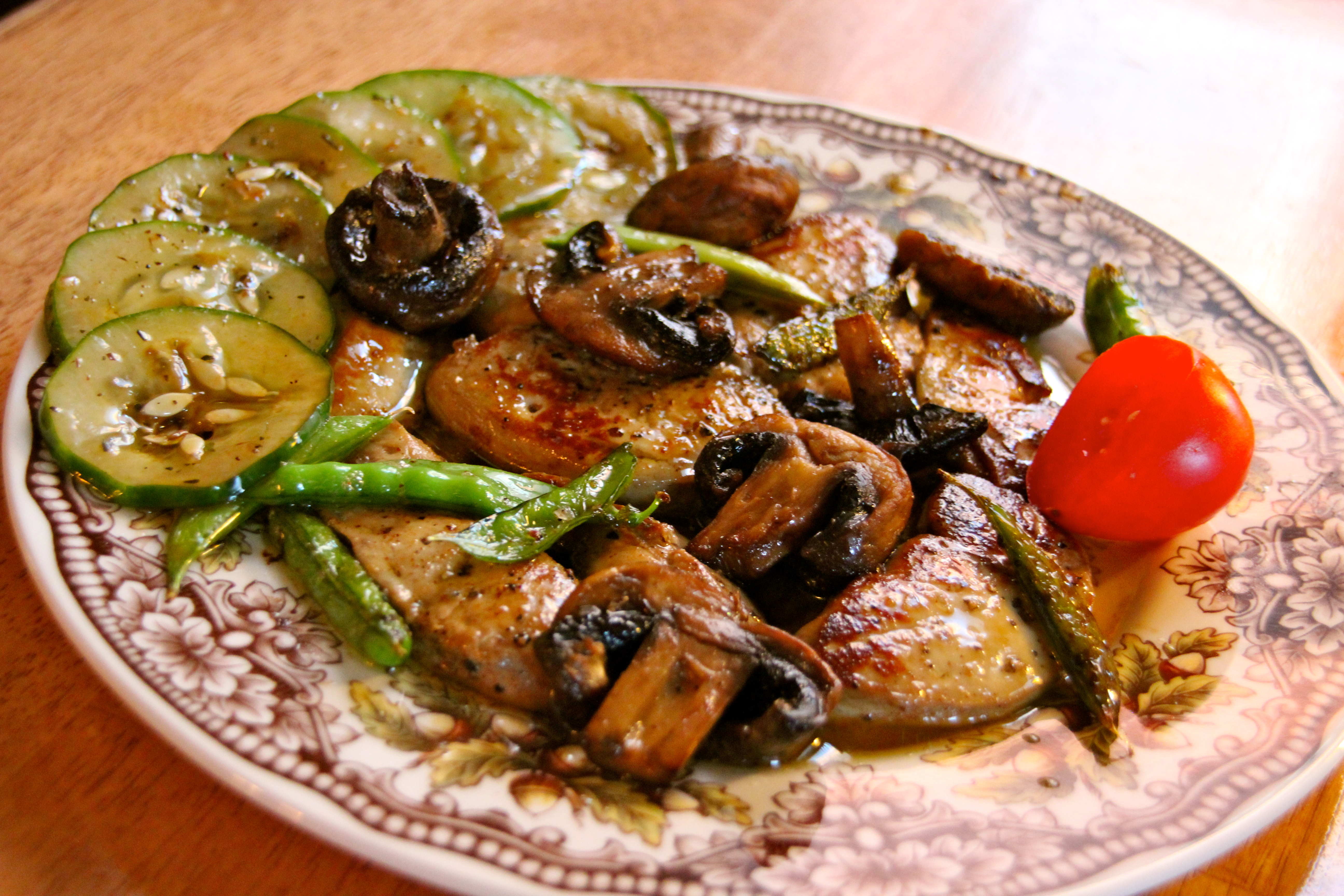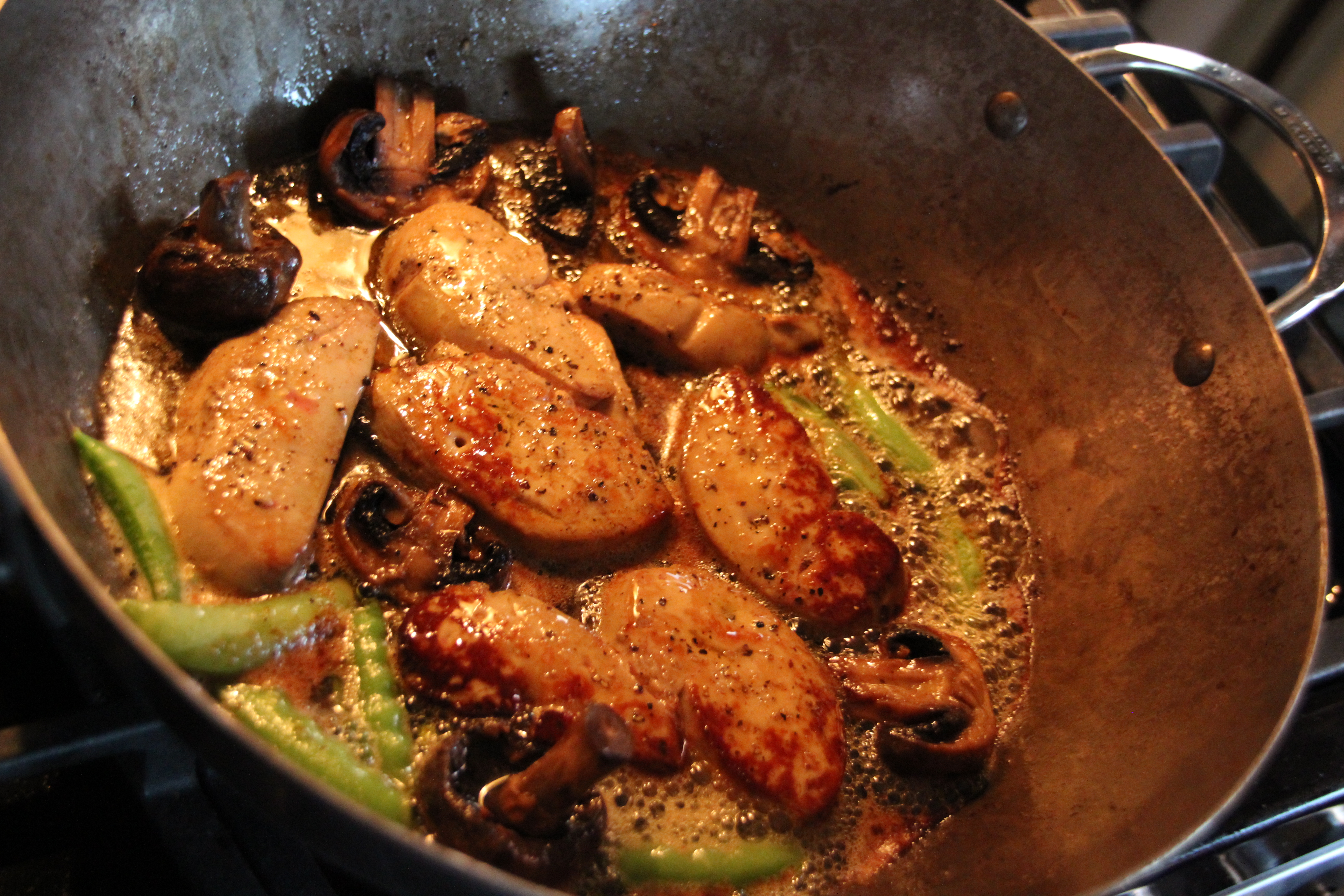 Sprinkle both sides of foie gras with sea salt and fresh cracked pepper, then dredge in flour. Place in a pan with a few tablespoons of melted butter, heated on a medium to high heat with mushrooms and snap peas. Sear each side of foie gras for one minute and remove. Discard all but 3 tablespoons of melted fat from the foie gras. Add the sherry and vinegar and let reduce until thickened, stirring often. Whisk in one tablespoon of butter to finish the sauce just before drizzling it on the foie gras. Amazing.