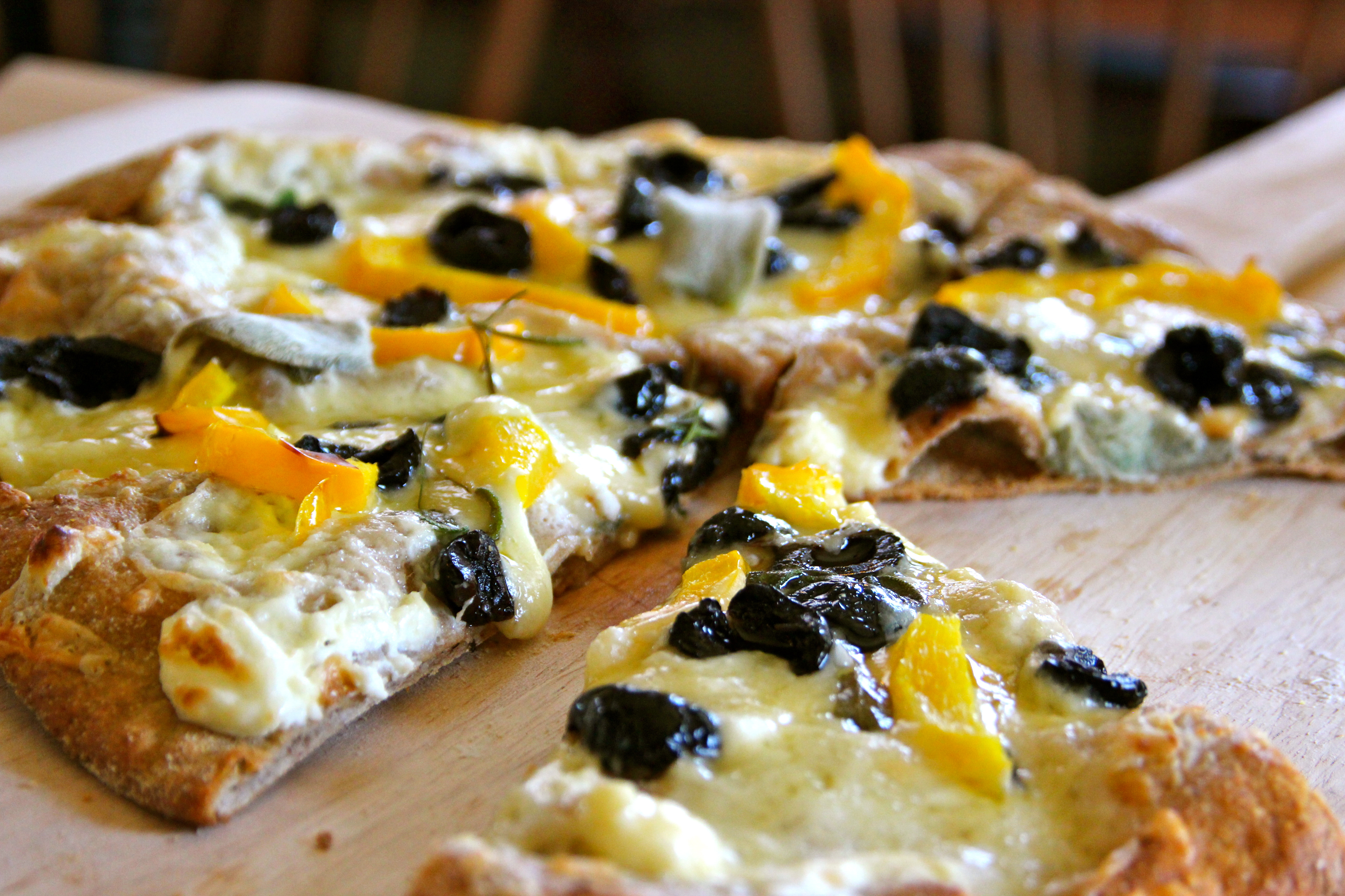 Combine last 3 ingredients first, then add remainder and knead well. Use a Kitchenaid mixer for best results. Let rest in a large bowl covered with plastic wrap for 3 hours and take out a piece the size of a large grapefruit. Keep the rest of the dough in the fridge for up to a few weeks and use whenever you want to bake during the week. Heat oven to 450. Roll dough ball out on a dusted flour board until about a quarter of an inch thick. Pre-bake on pizza stone until slightly golden in color. Remove from oven and spread 1 cup of cream cheese on crust followed by 2 cups Emmentaller or Gruyère cheese. Top with French oil-cured olives, slivers of sweet yellow pepper sage leaves and top with rosemary sprig. Bake until cheese melts – about 8 minutes.