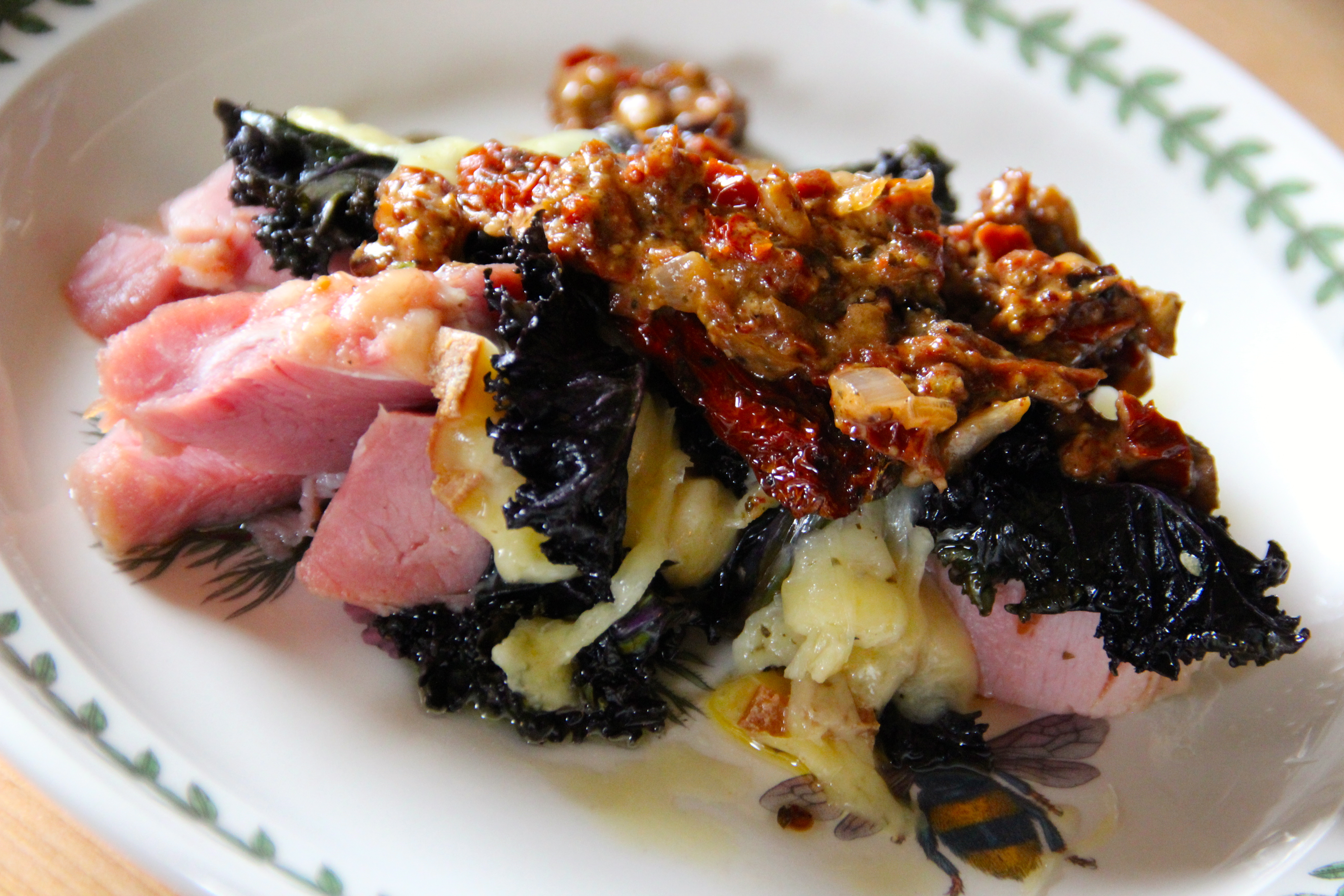 Roll a few pieces of pork/ham with 3-5 sticks of cheese in a kale leaf and place in a heat-proof baking dish with a few teaspoons of extra-virgin olive oil lining the bottom of the dish. Place 3-4 sticks of cheese on the top of each roll as well as piece of sun dried tomato. Bake for 15 minutes, or until cheese is melted.