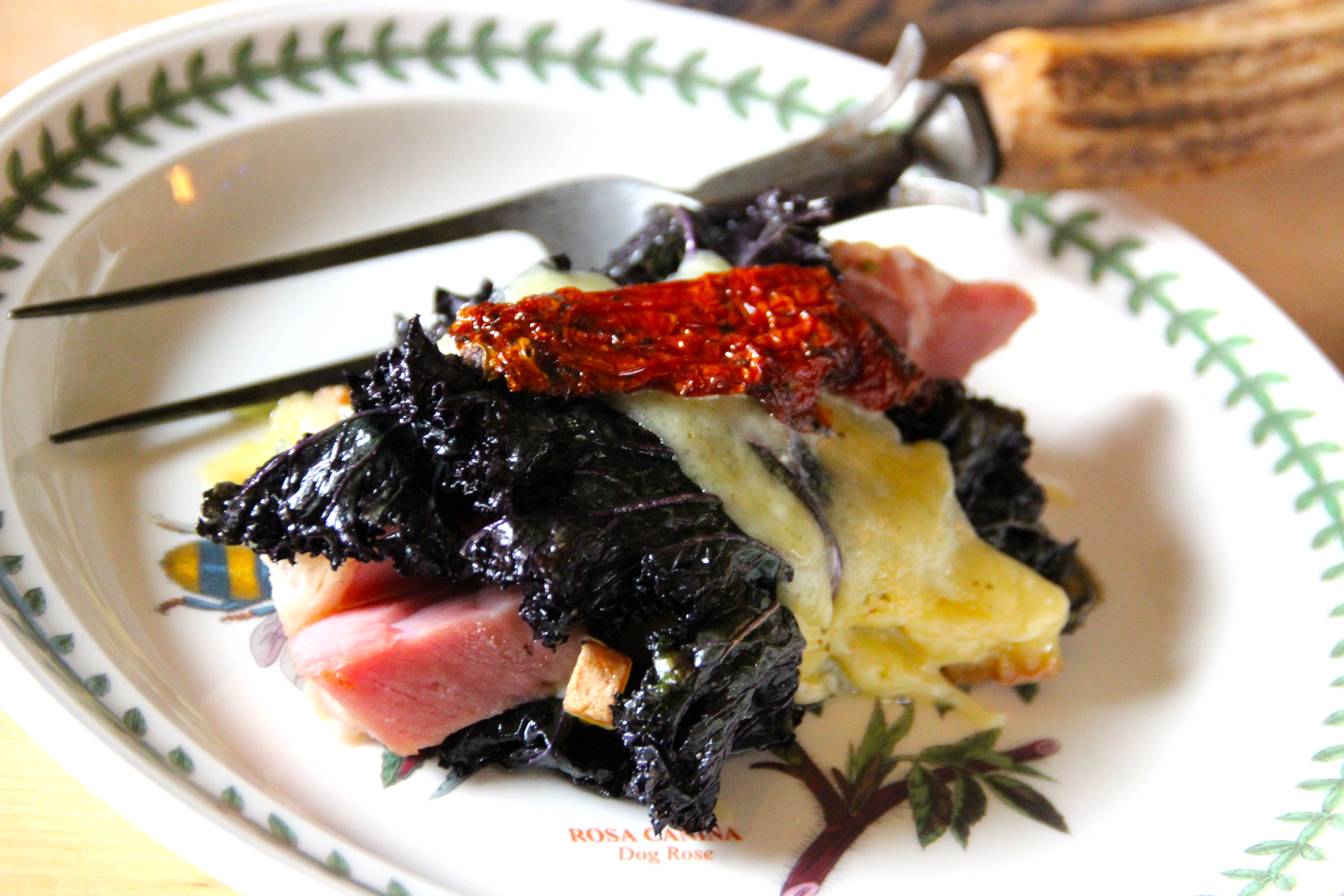 Sautéed winter Kale is wrapped around juicy pork and French Compté cheese, topped with more cheese and a sun-dried tomato sauce. This elegant dish rewards you with burst of flavours with every bite. Using pork or ham that you already cooked, it can be done in 30 minutes….that’s the amazing part.
