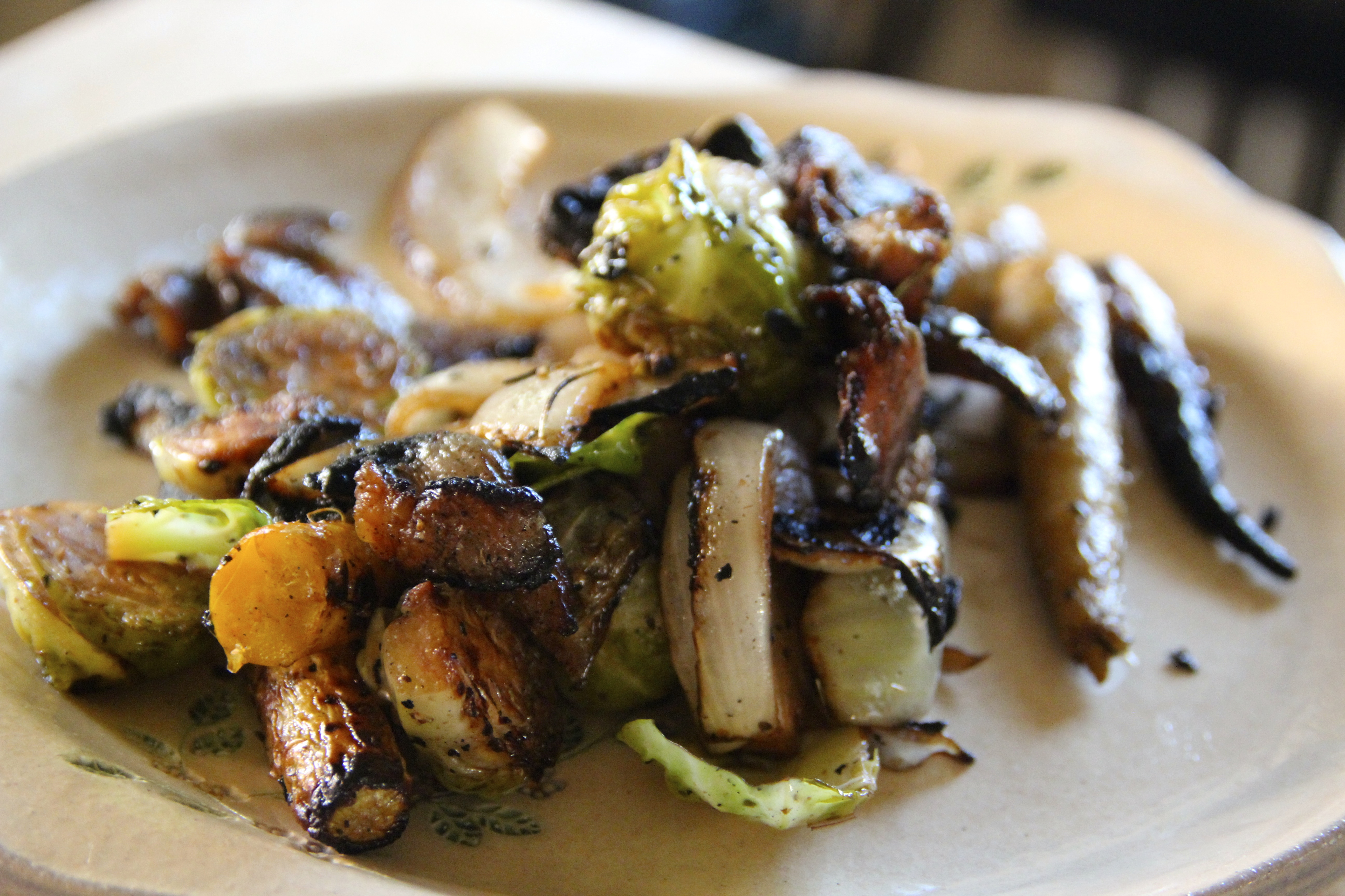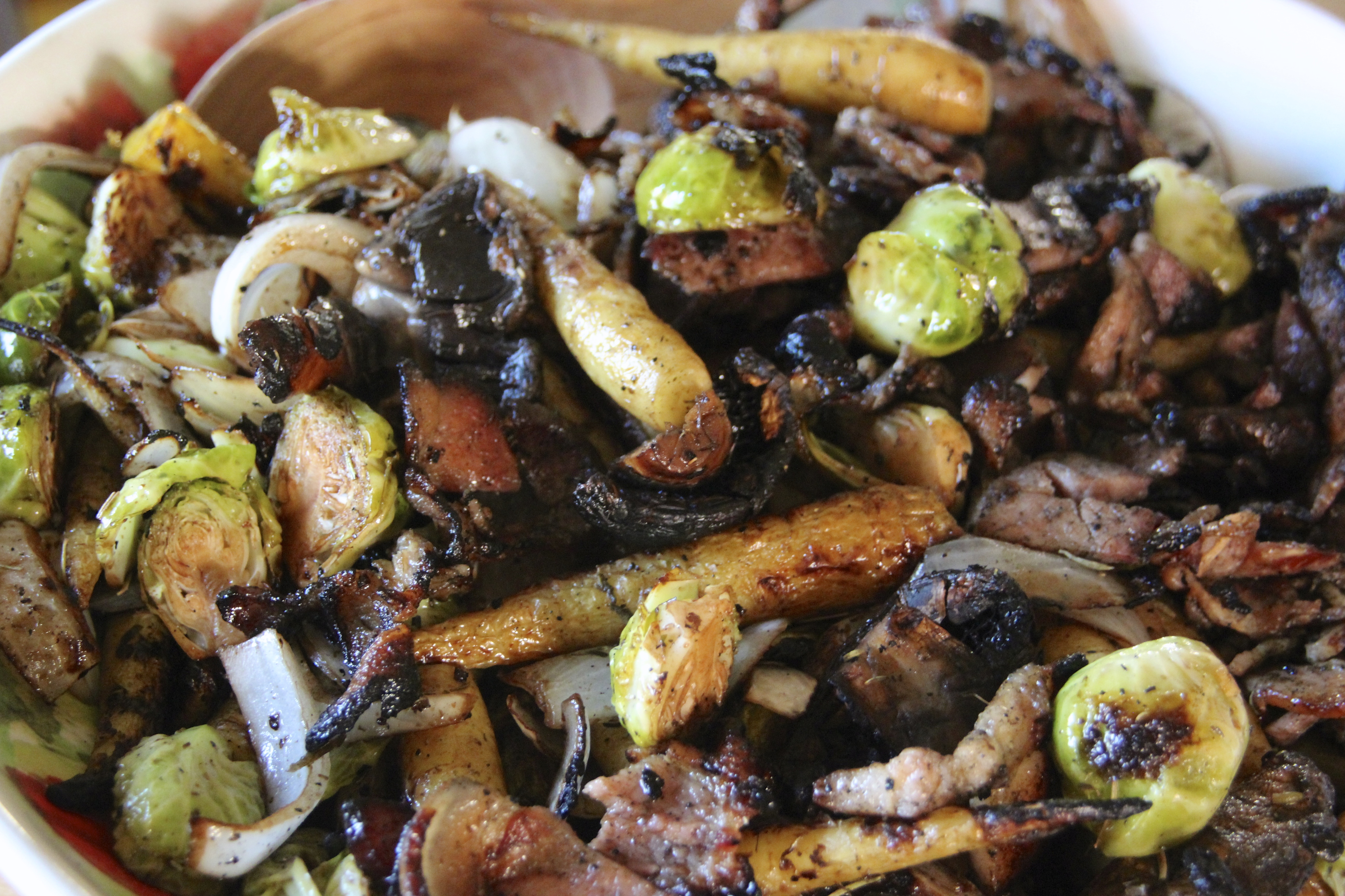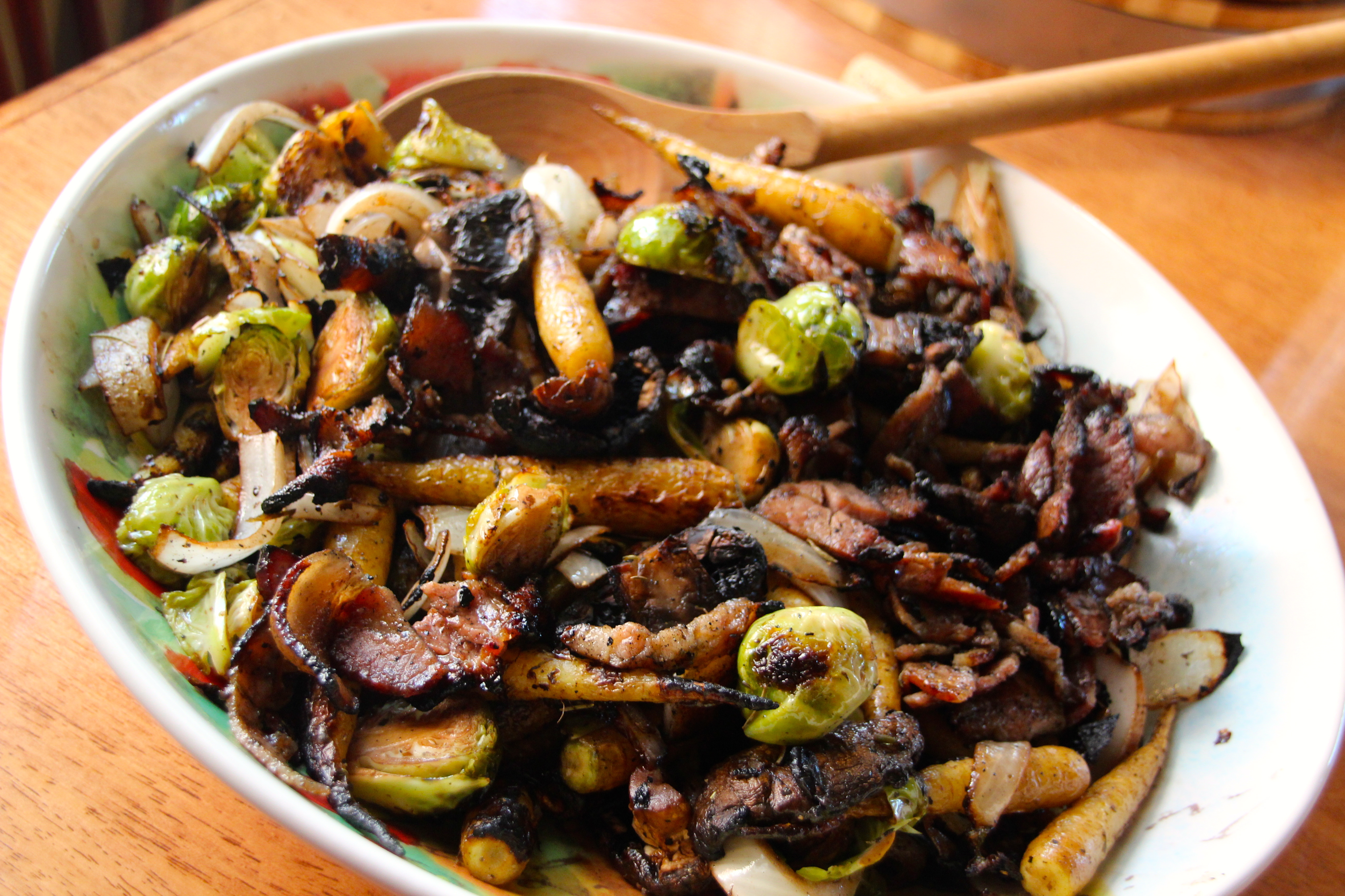 Over a large hot charcoal fire, grill the Lardon (or bacon) in a grill basket tossing constantly when the fire stats to flare from the melting fat. When slightly/fairly charred and the bacon is cooked, remove from fire and chop into medium pieces. put aside. Grill the two different bowls of vegetables at separately in a grill basket as the carrot and brussels sprouts take longer. Close the cover of the grill while cooking, but toss the vegetables fairly often for even cooking. When slightly to nicely charred, add a few tablespoons of brown sugar to each grill basket and toss just before removing from fire. When everything is grilled, place together in a very large serving bowl and toss. Drizzle a bit of extra-virgin olive oil on top and toss again slightly. Voila! Enjoy the summer’s flavours with this great feast of the season!