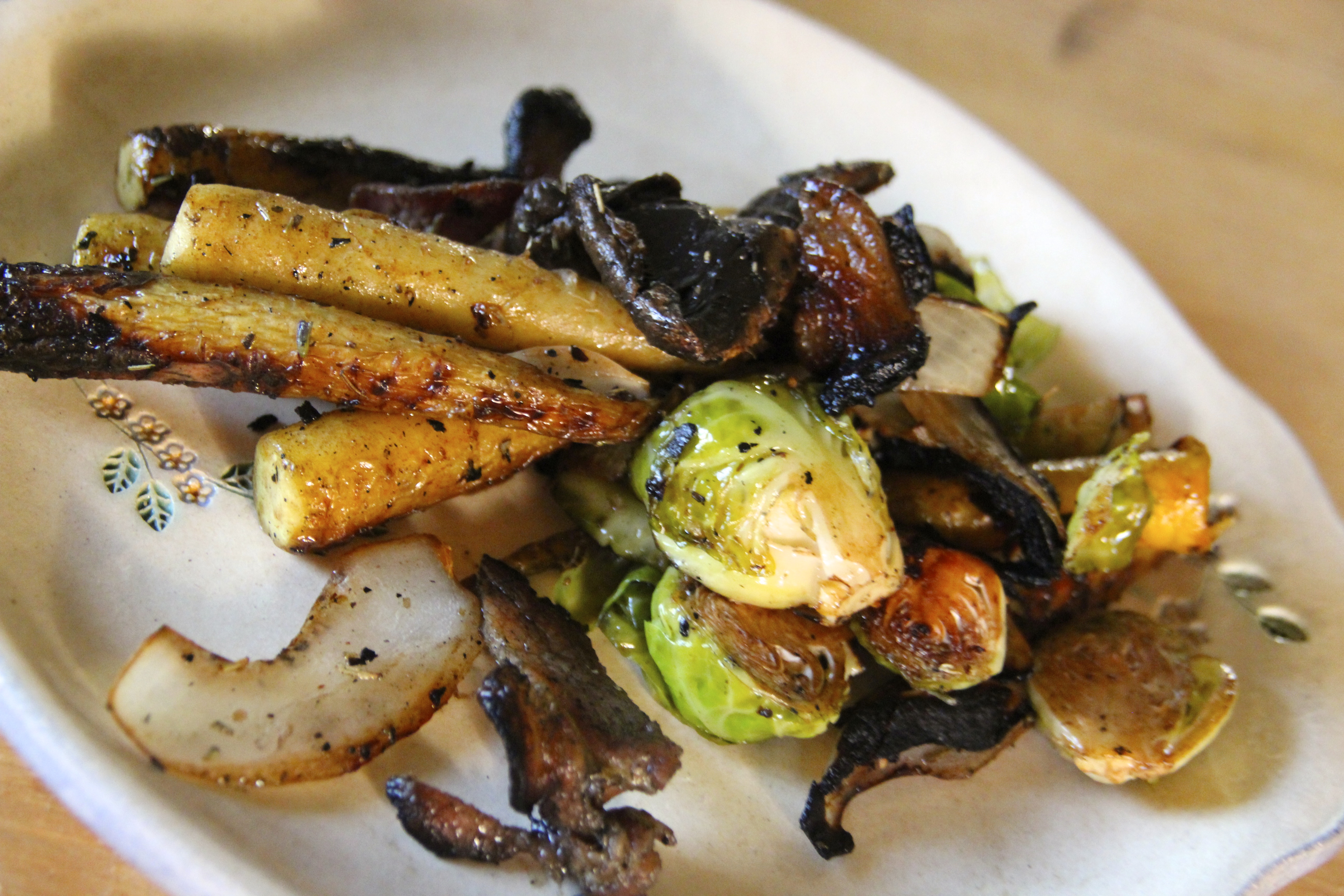 The Recipe! ~~~~~~~~~~~ 2 medium-large rectangular, stainless grill baskets 1 lb of brussels sprouts, cut in 2 lengthwise 1 lb of carrots, each cut lengthwise into 4 strips (I used baby white carrots…or parsnips may be used) 2 lbs of large mushrooms, cut in two 3 large onions cut into large slivers 1.5 lbs of lardon (french bacon) or naturally cured american bacon 3/4 cup of extra-virgin olive oil 1/2 cup of balsamic vinegar Sea Salt and fresh cracked pepper Herbs de Province Juice of two limes 4-6 tablespoons of brown sugar