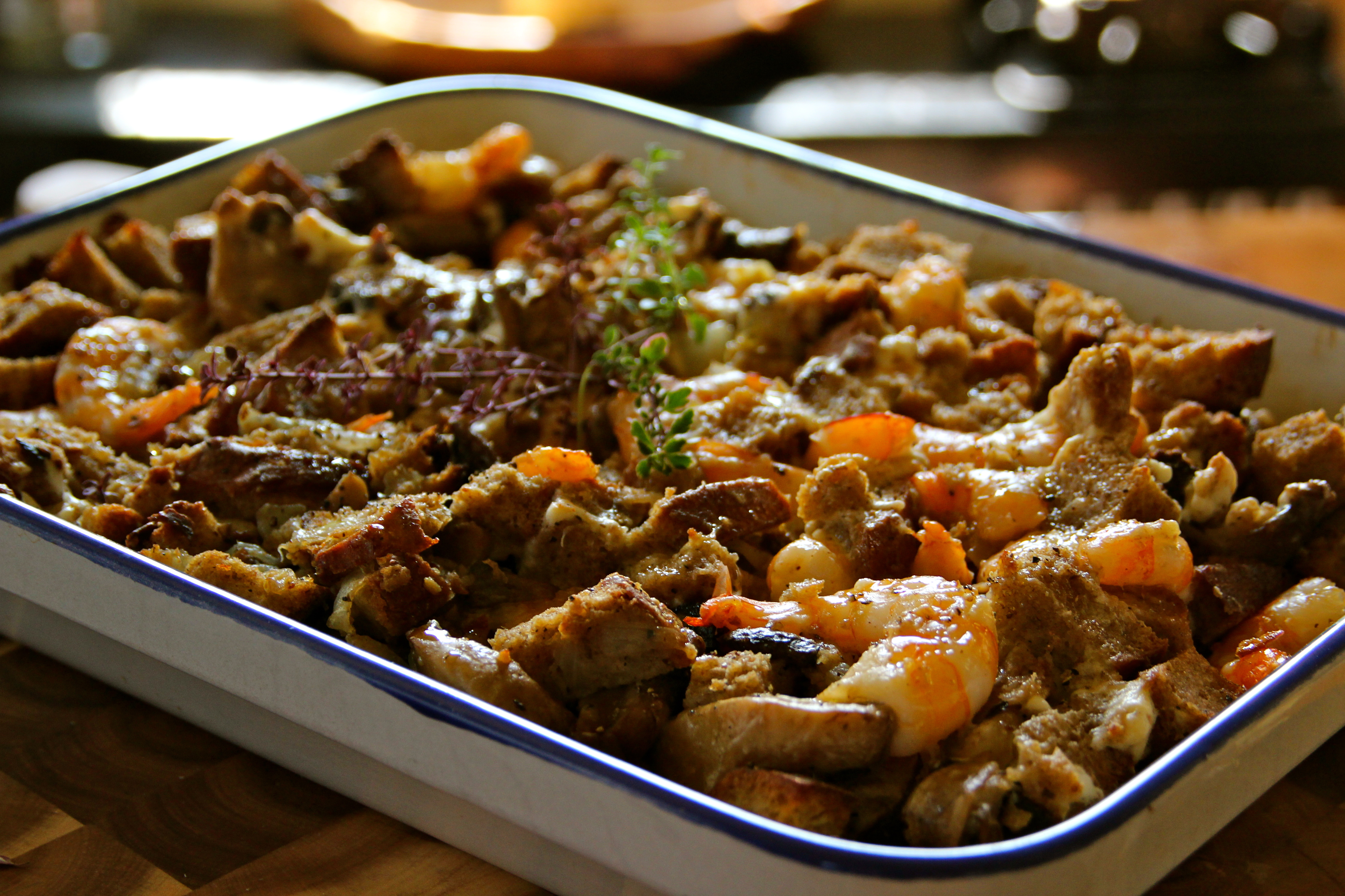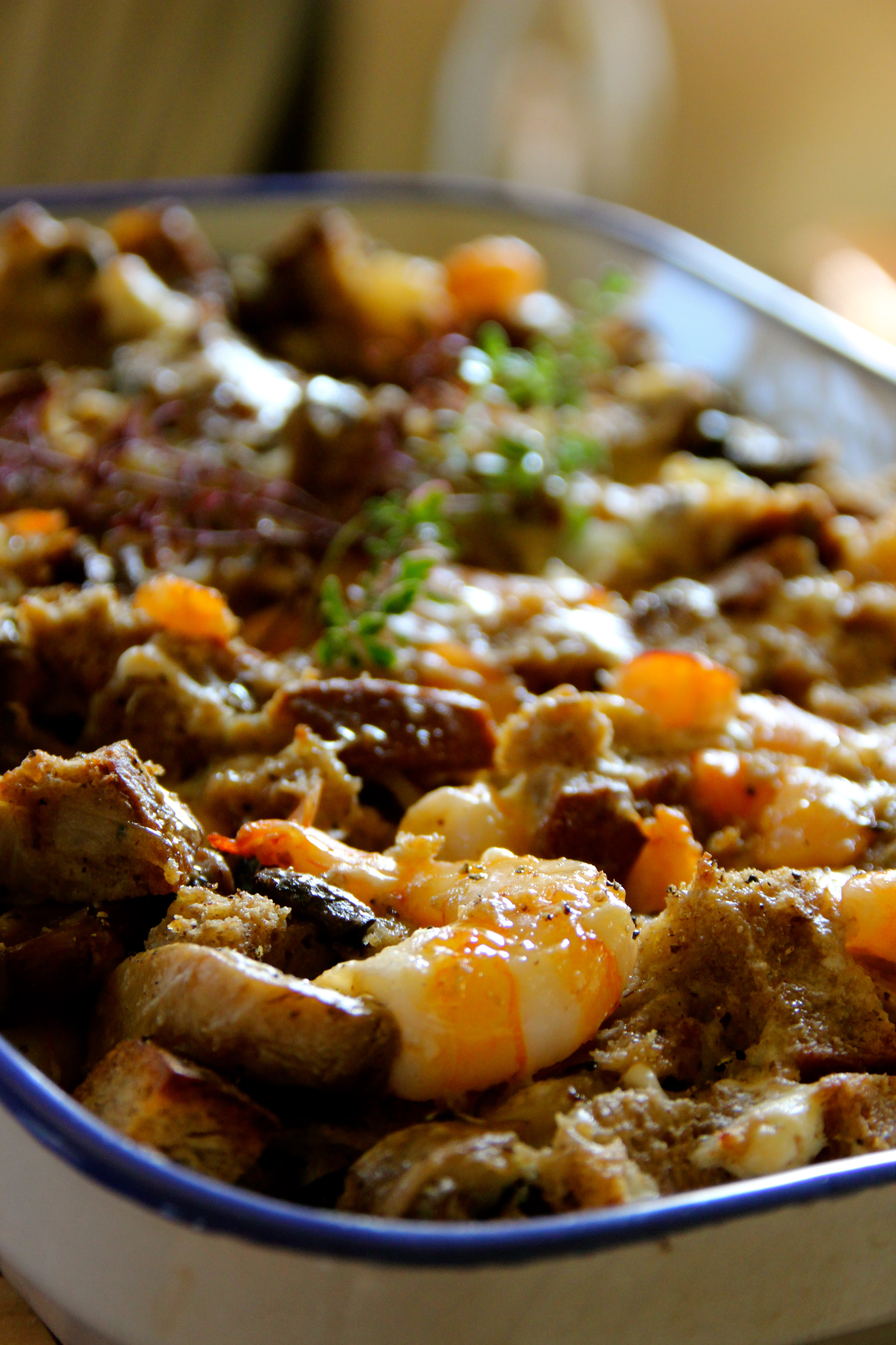 Pre heat oven to 350. Saute onion and mushroom with a large pinch of salt and several grinds of the pepper mill in a large covered pan with butter and extra-virgin olive oil. When slightly browned, add bread,thyme, chicken stock, wine, sour cream and shrimp. Shut off heat and mix well. Place in a large gratin dish and place in pre-heated oven for 30 minutes. Drizzle with extra-virgin olive oil before serving. Serve with salad and dry white wine.
