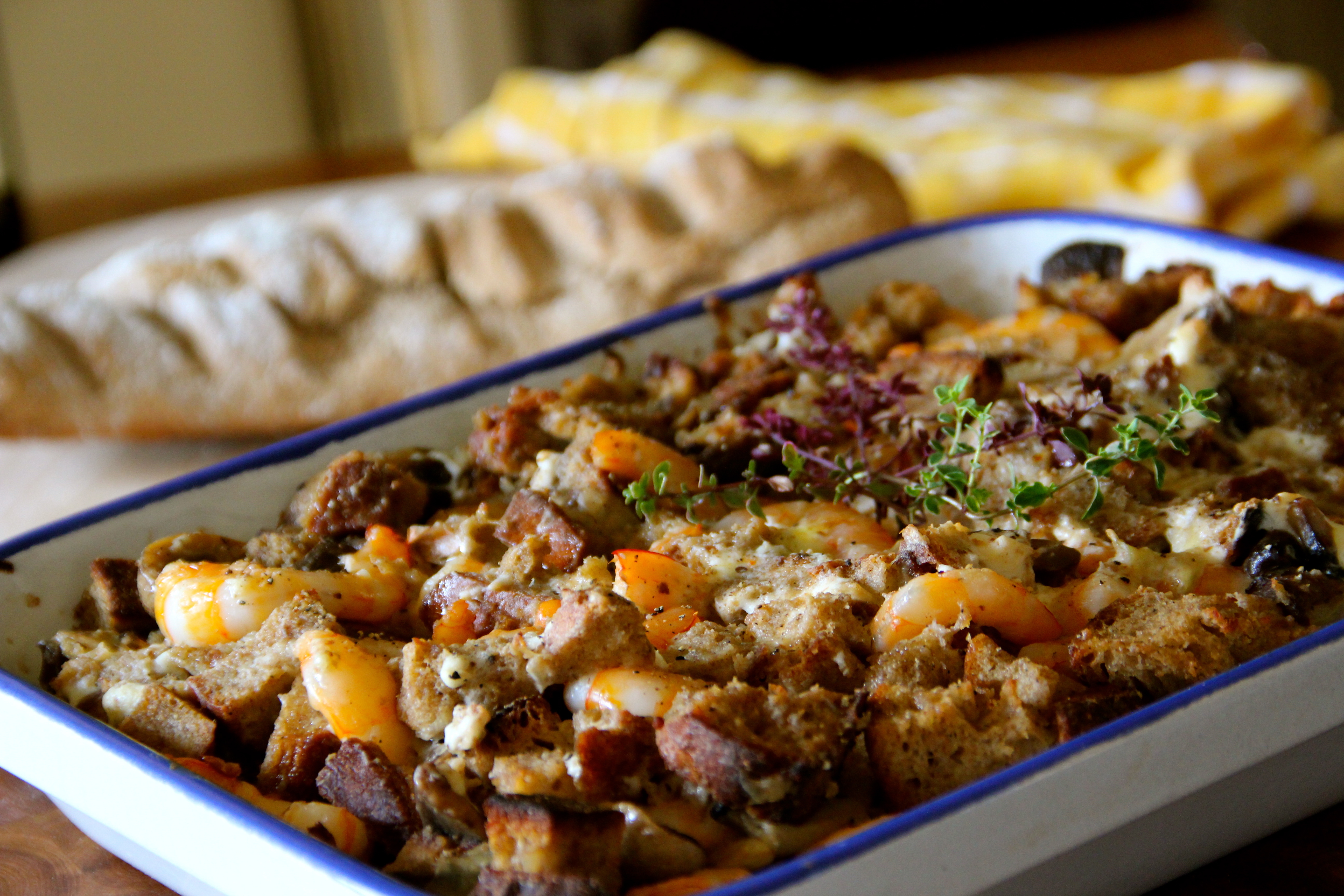 Wow! Rustic Country French bread is combined with shallots, mushrooms, sour cream and large shrimp for a gratin like you’ve never had. Luscious French country comfort food is now ready for you to experience. Amazing flavours in less than an hour…