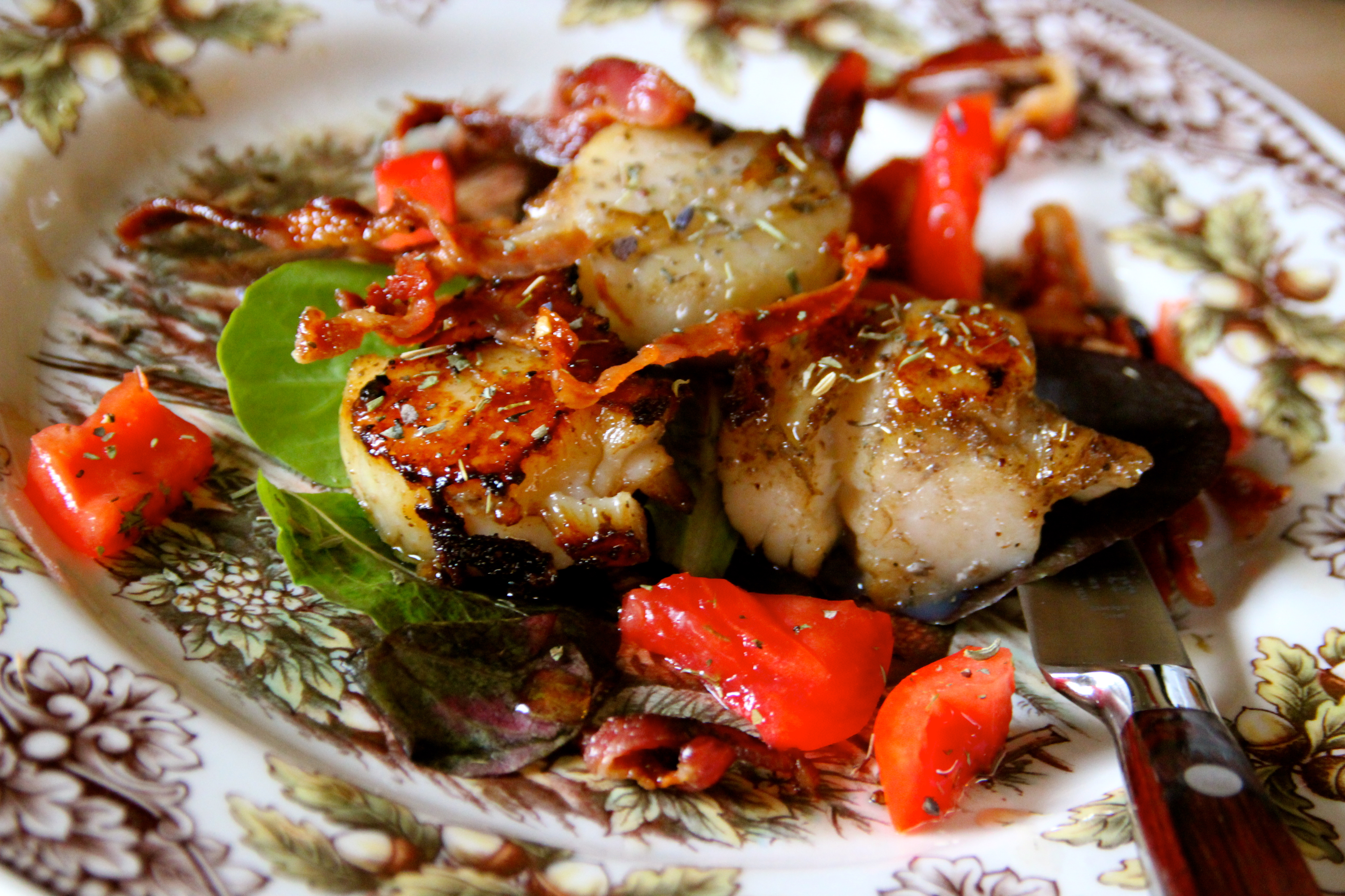 The Recipe! 6 large sea scallops per person 3 strips of bacon 1 medium ripe tomato, seeded and diced Herbs de Province Sea salt and fresh cracked pepper Butter Truffle oil