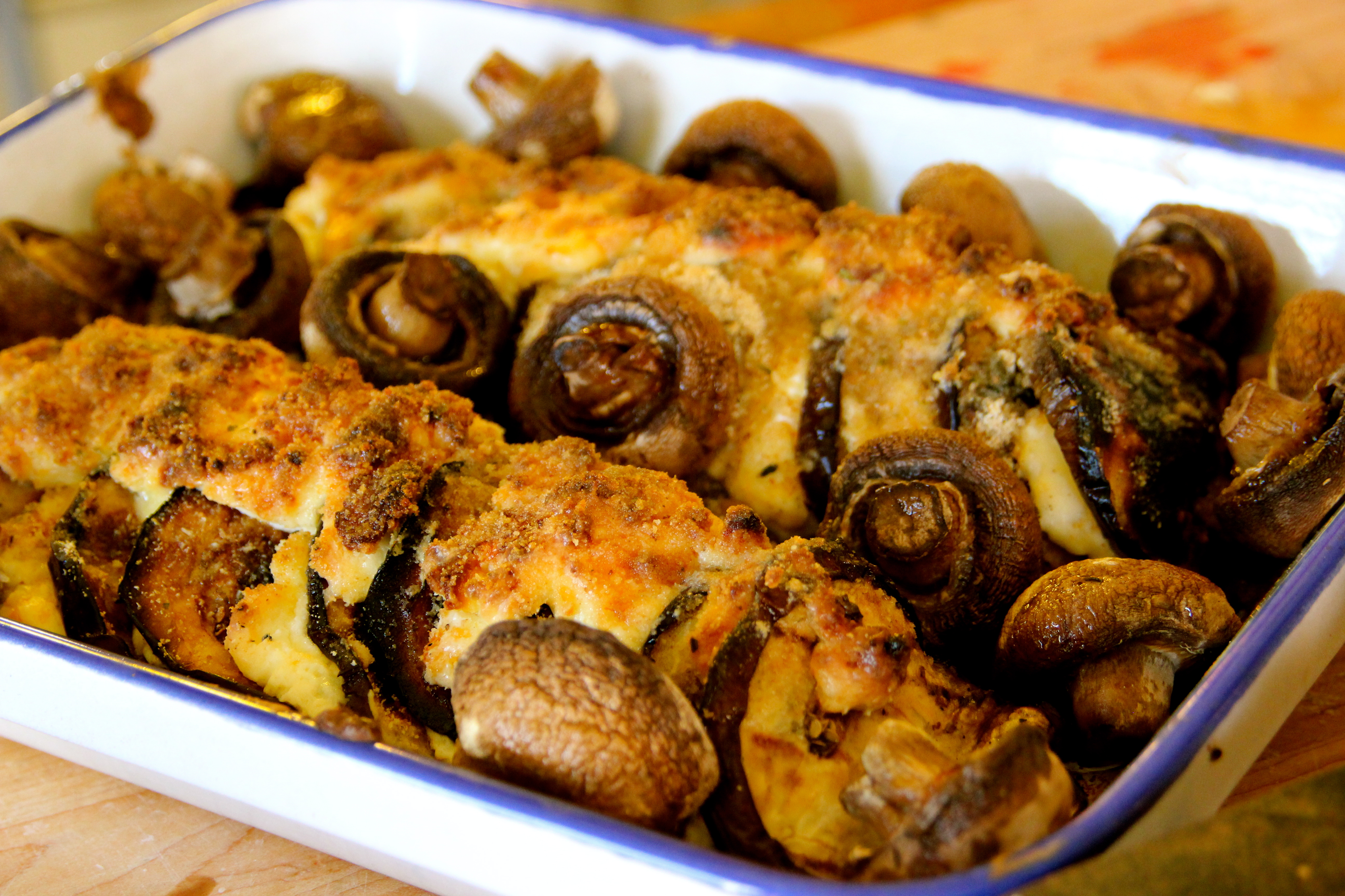 Place eggplant slices in casserole dish, placing a large dollop of cheese between slices, stacking the slices a little off each slice by about 1/2 inch so that it runs the length of the pan in two rows (as seen in picture). Place dollops of cheese on top of eggplant. Top with bread crumbs and mushrooms. Cook for about 15-20 minutes and drizzle melted butter over egplant and mushrooms just before serving.