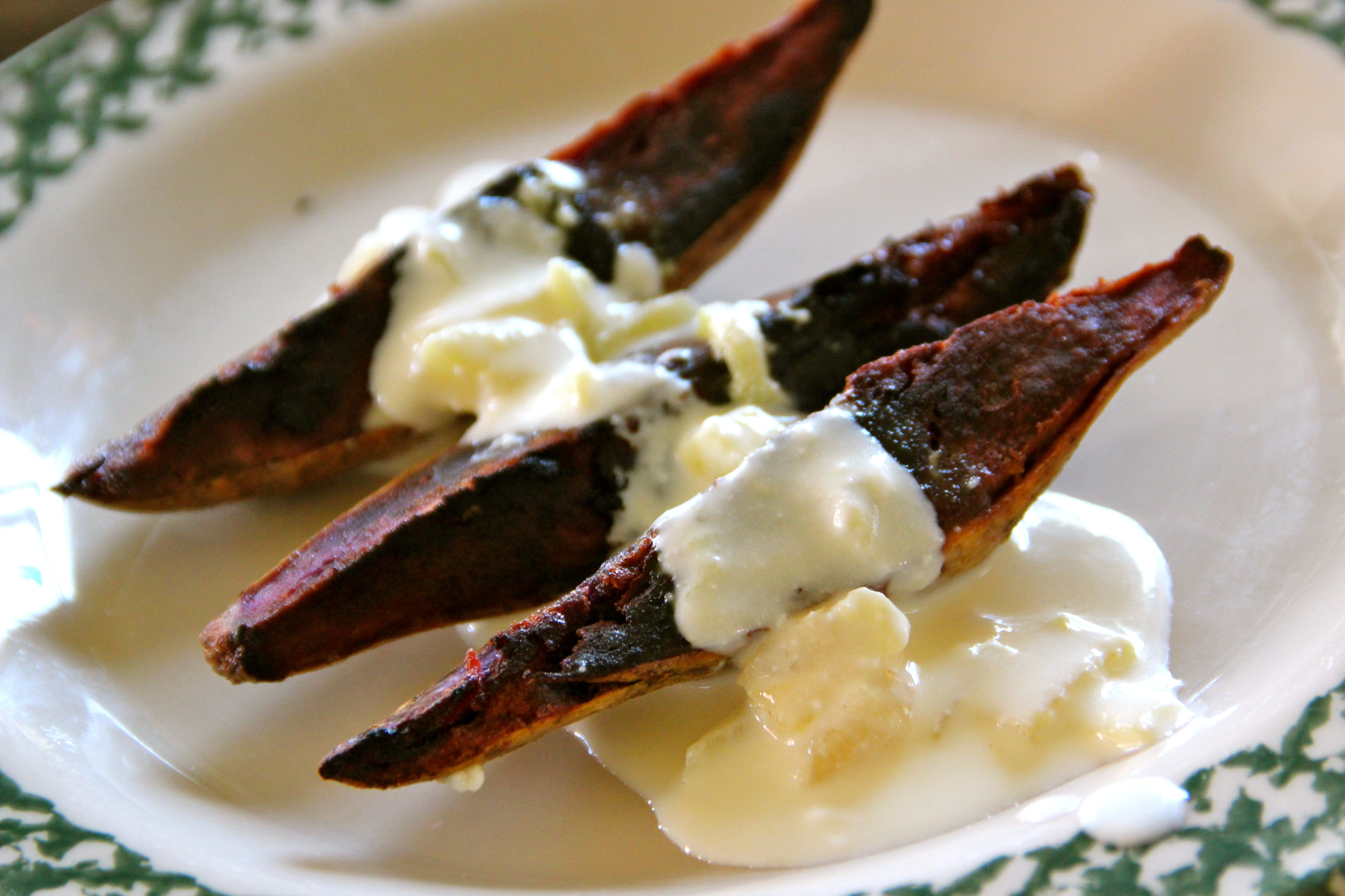 ~ 4 Hawaiian sweet potatoes (or any sweet potato) ~ 1 cup of sour cream ~ 1 tablespoon of honey ~ 1/4 cup of fresh pineapple chopped fine ~ Butter