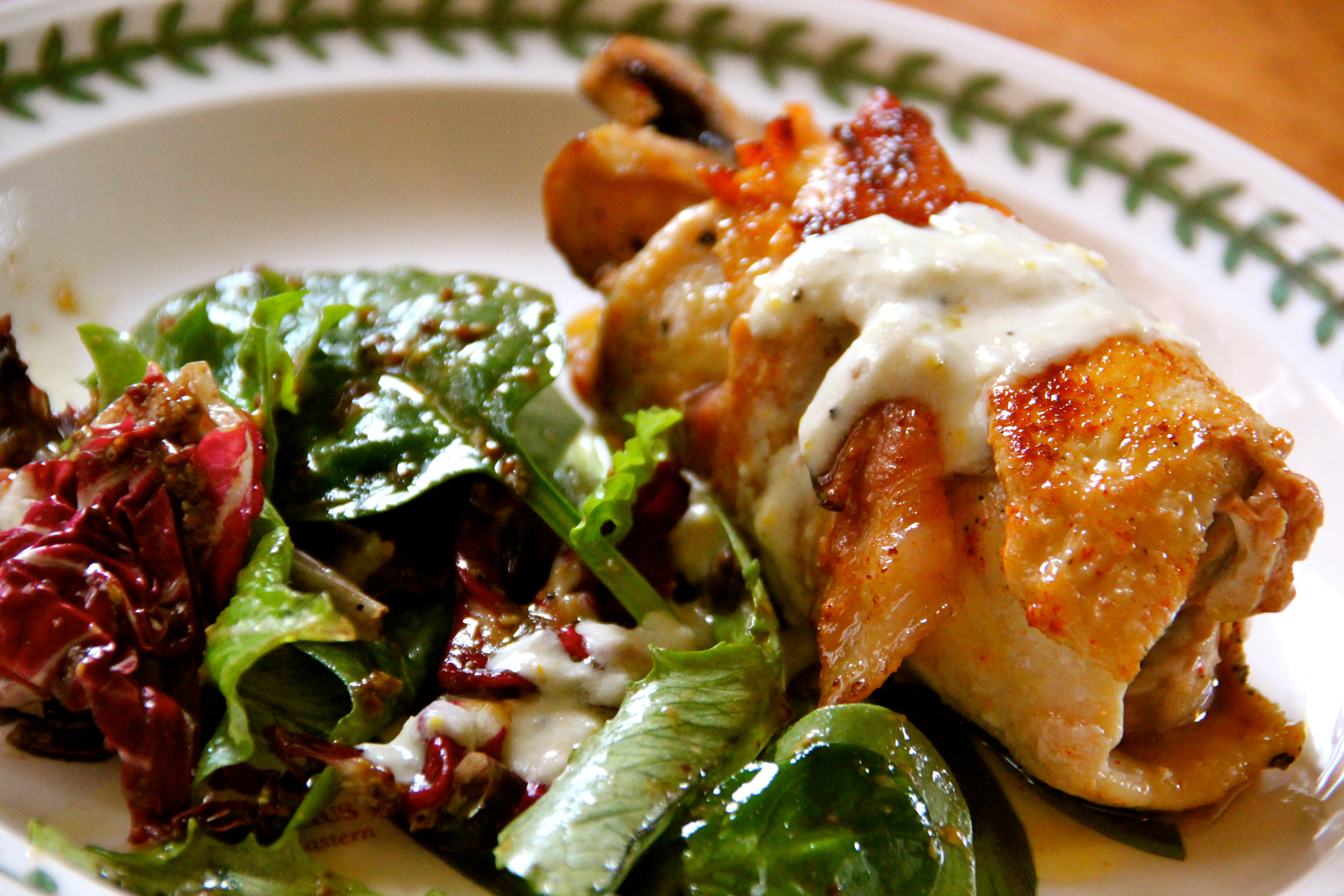 Chicken stuffed with mushrooms, wrapped in bacon, pan seared and then topped with an orange zest cream sauce. Amazing in less than 30 minutes.