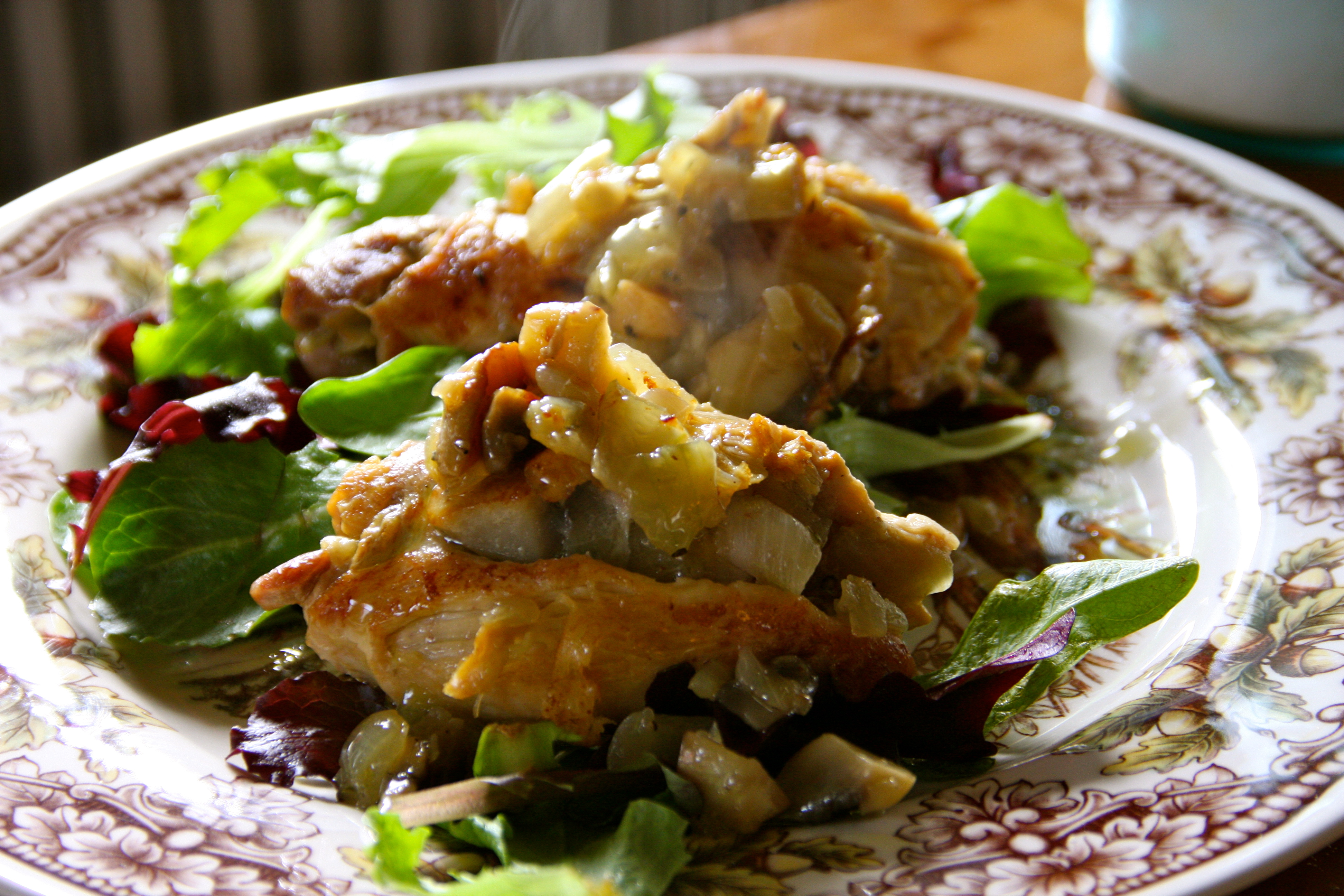 When chicken is done, heat onion and mushroom mixture in the microwave for 3o seconds and spoon over chicken once it is plated.You may place chicken on mixed greens for a beautiful dish. Top with chopped rosemary and fresh ground pepper.