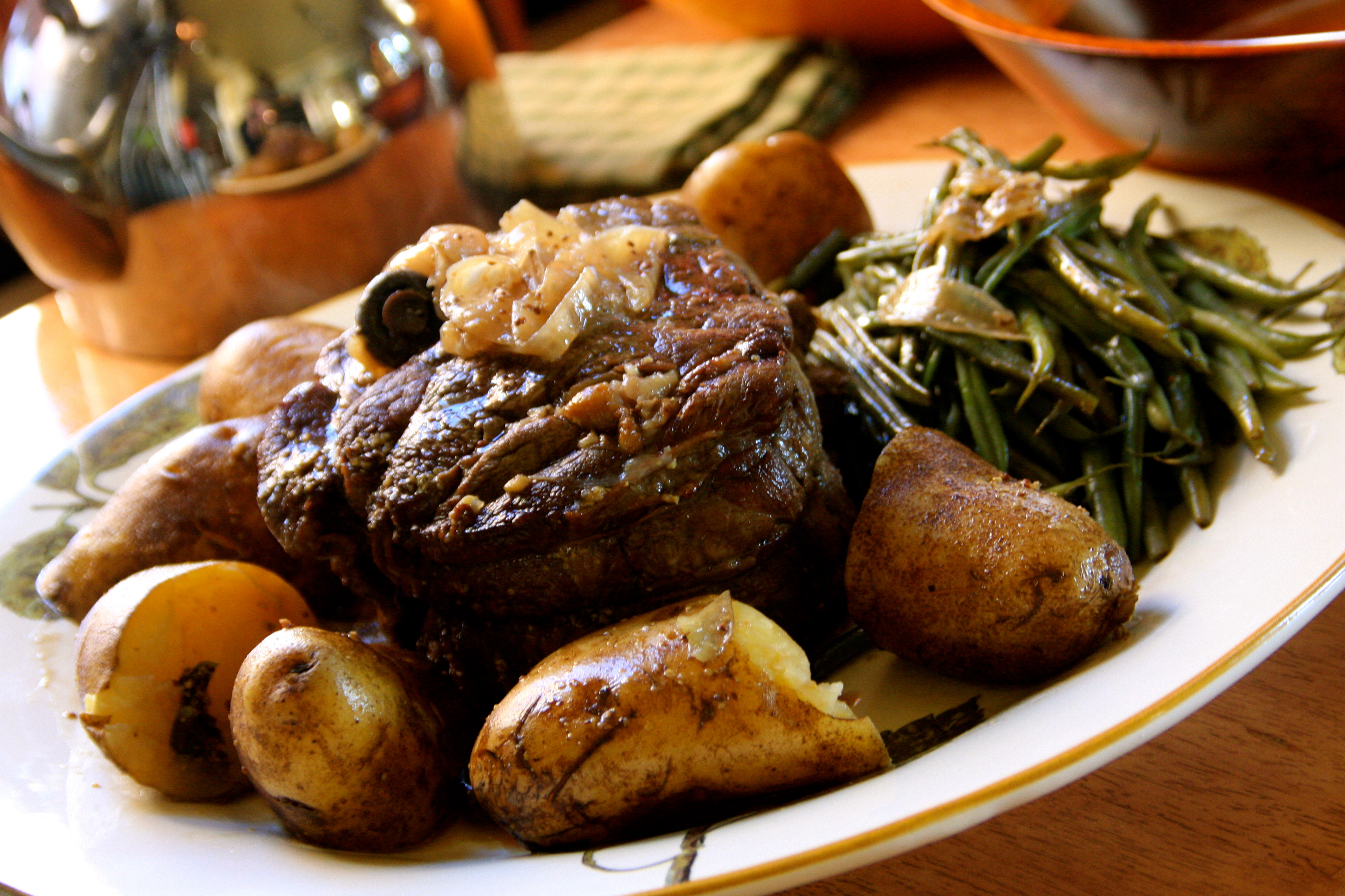 Place pot in oven and bake for 1 hour. After an hour, place halved potatoes in pot with French beans and cook an additional 1.5 hours. Remember to remove bay leaves when done.