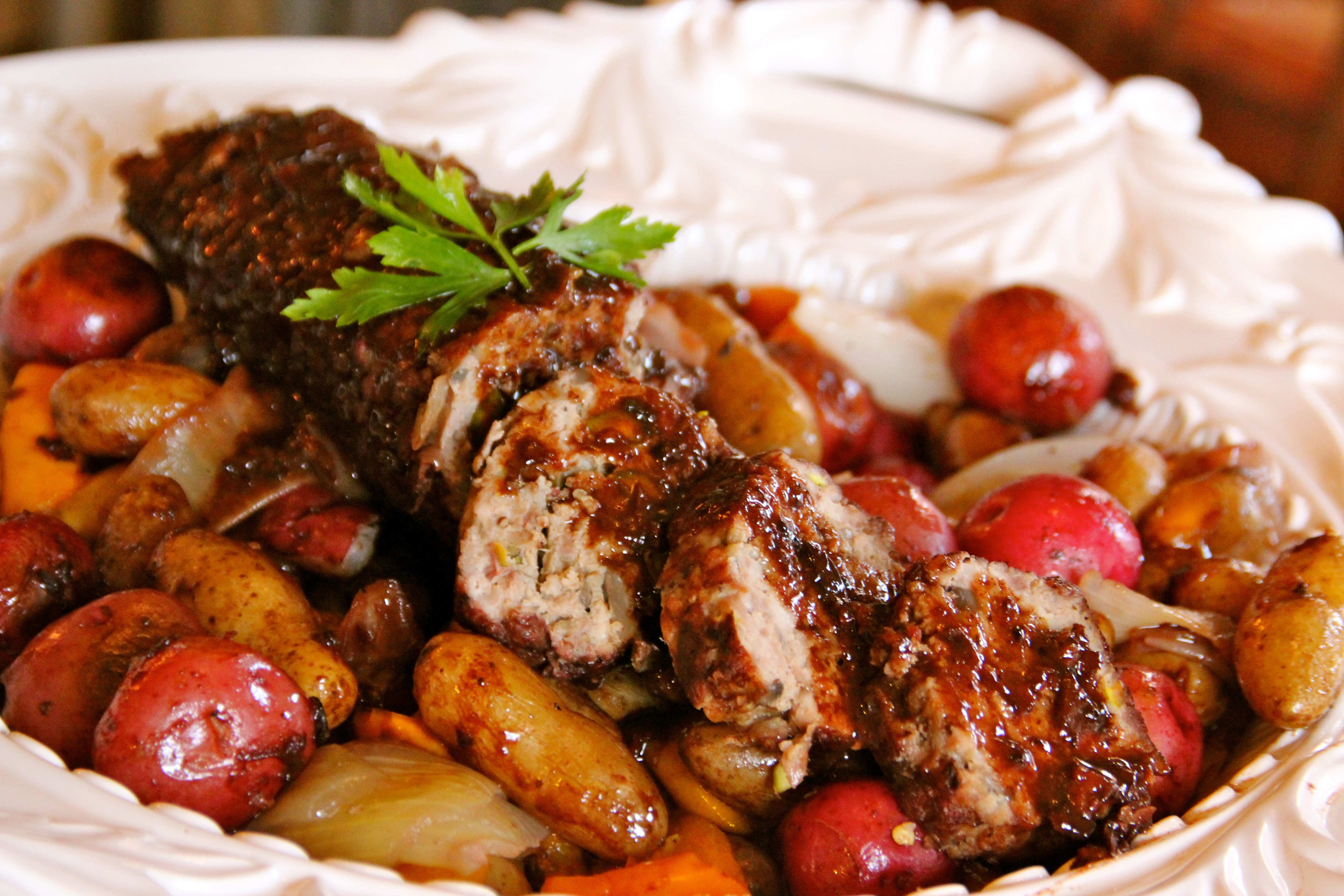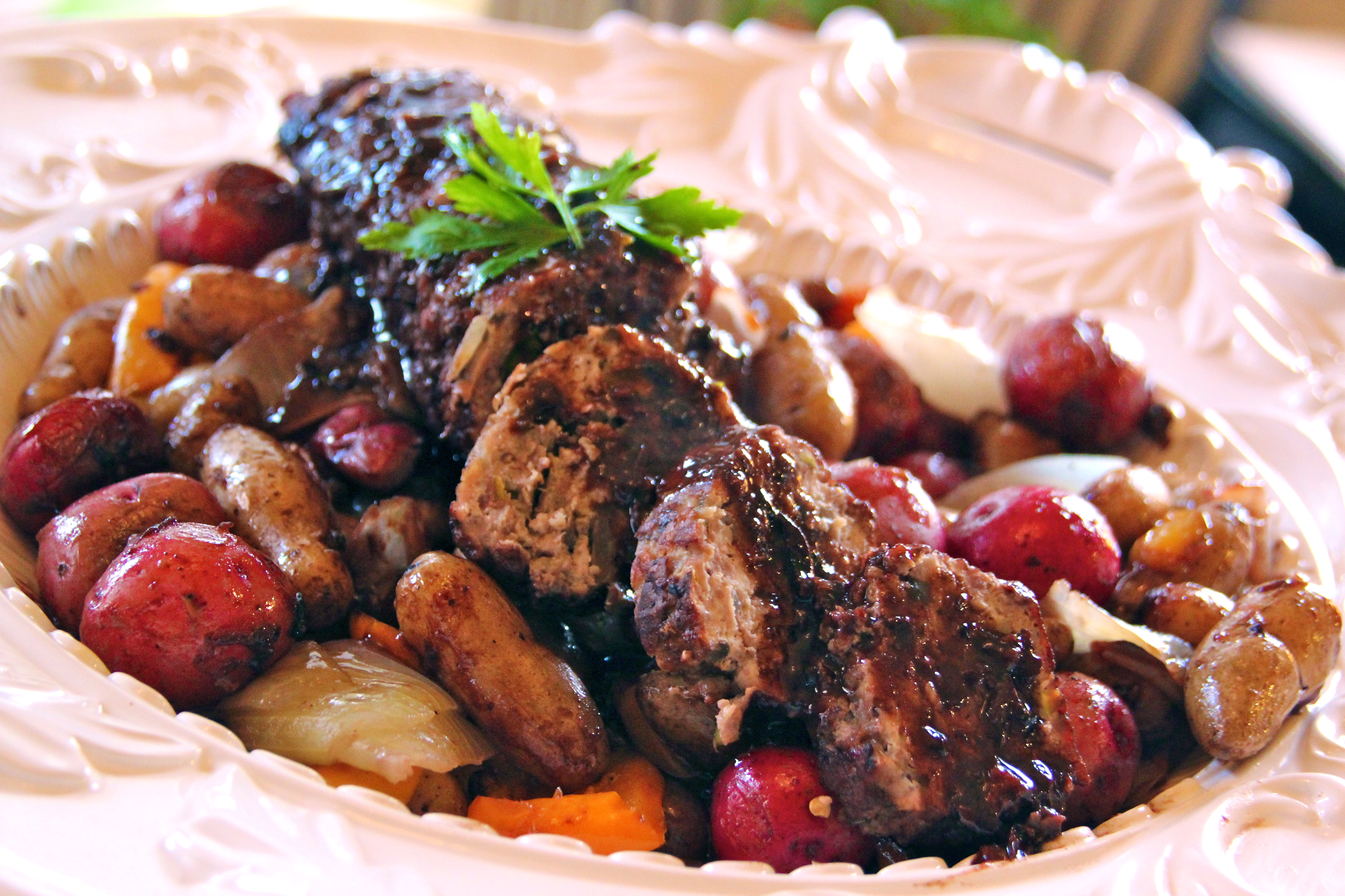 Mix well, place on buttered aluminum foil in a cylindrical shape and roll sausage meat tightly as in video. Make two of these. One can be placed on a very low simmer in a covered pan with several inches of water, still wrapped up in the foil for 1 hour. The other can be unwrapped gently and browned on all sides with butter and extra-virgin olive oil in a large pan. Place potatoes and onion in the pan and brown as well. Add sweet yellow pepper if desired as in video, several teaspoons of sea salt and several teaspoons of fresh ground pepper. Add 2 cups of dry red wine, roux for thickening ( 3 tablespoons of flour mixed together with 5 tablespoons of cold water) cover and simmer for an hour on a low-medium heat. Remove cover after and hour and let liquid reduce to almost none, stirring vegetables occasionally. Remove potatoes to a nice platter and top it with the sausage roll, sliced into 1/2 inch slices. Deglaze pan with one cup of dry red wine, scrapping bits off bottom of pan and reducing the liquid until it is slightly thickened, top the sausage with this sauce. This sauce is killer! It is truly a thing to witness.