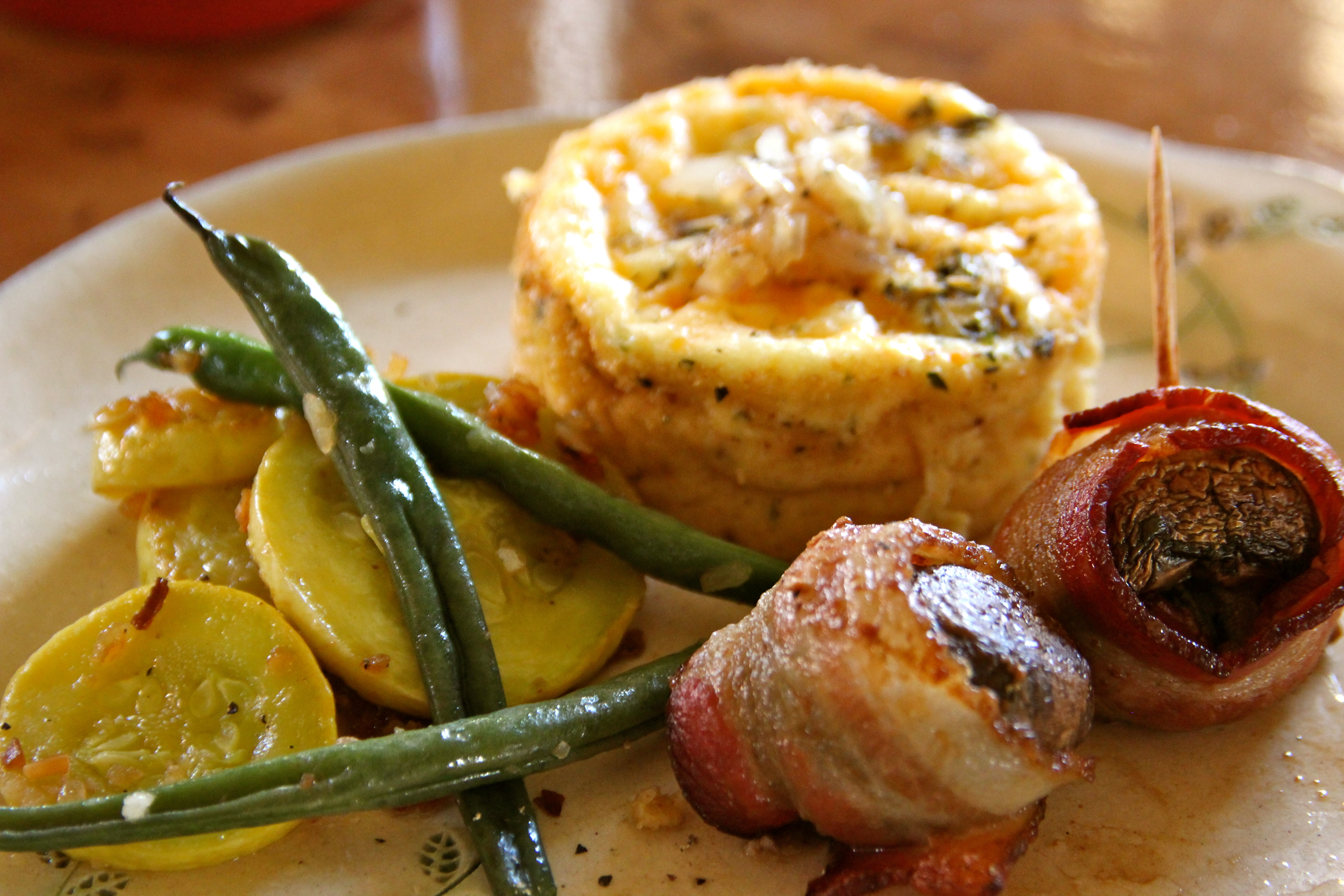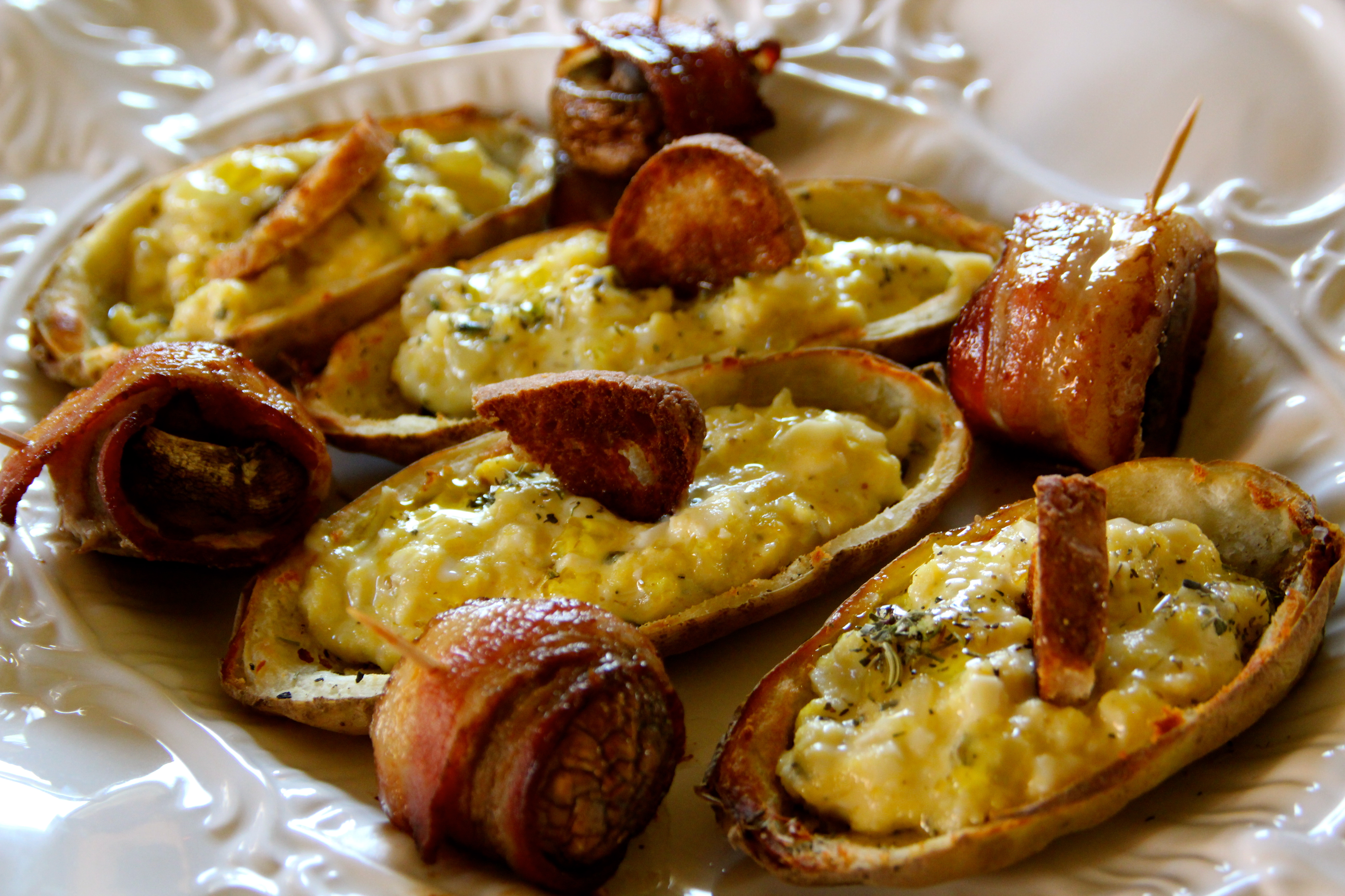 You gave us too many gorgeous, delicious dishes upon which to comment! They all look fantastic and I can’t decide which I would want to sample first. Ok, that’s entirely not true. The crabmeat cheesecake calls my name. Then those potato boats. Both look divine. Well, the mushrooms also. Who can resist mushrooms wrapped in bacon? Beautiful dishes.