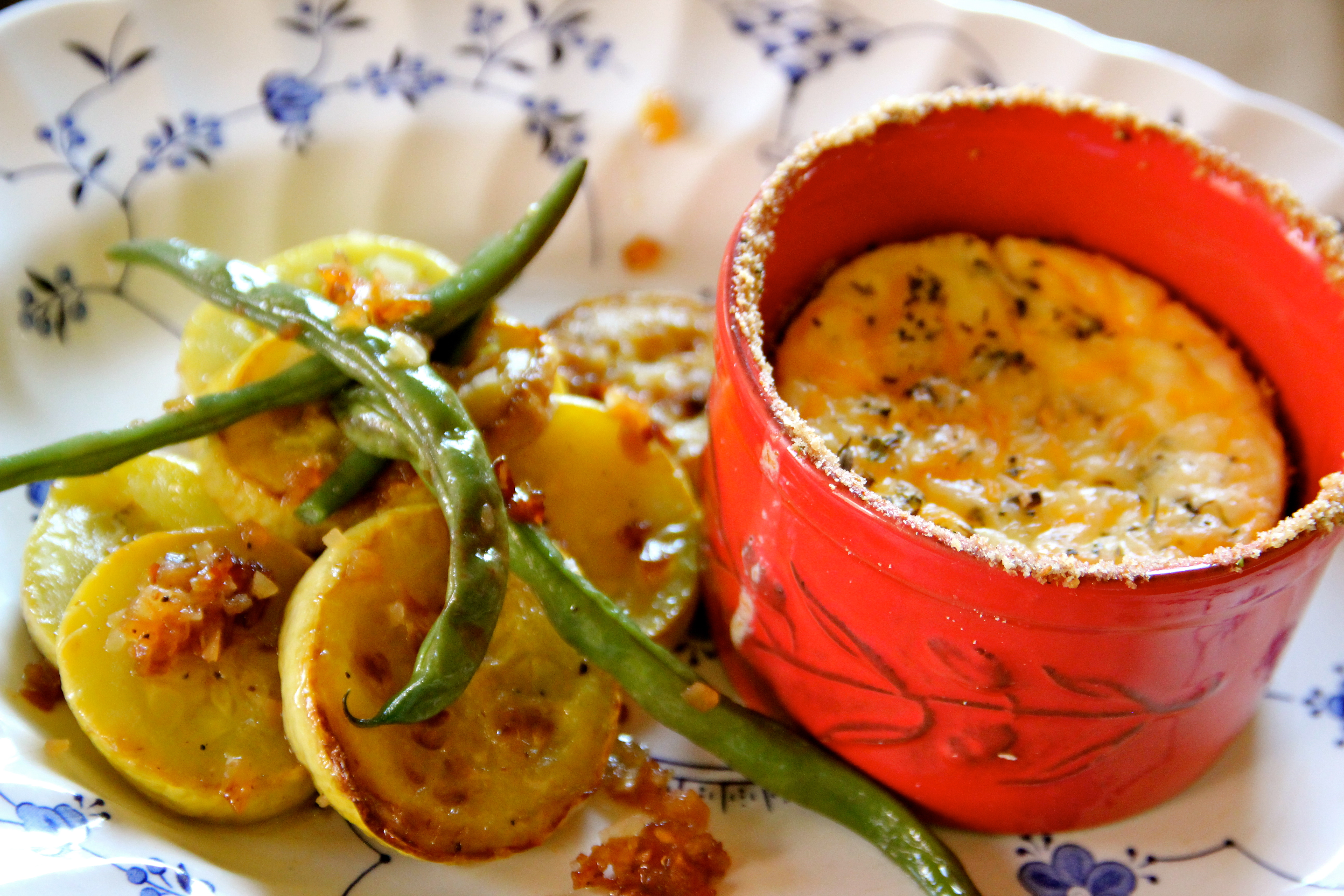 Pour evenly into ramekin molds, sprinkle cheese on each and place on a baking sheet in the oven for 40 minutes. Let cool for 5 minutes before un-molding from dish (or keep in dish).