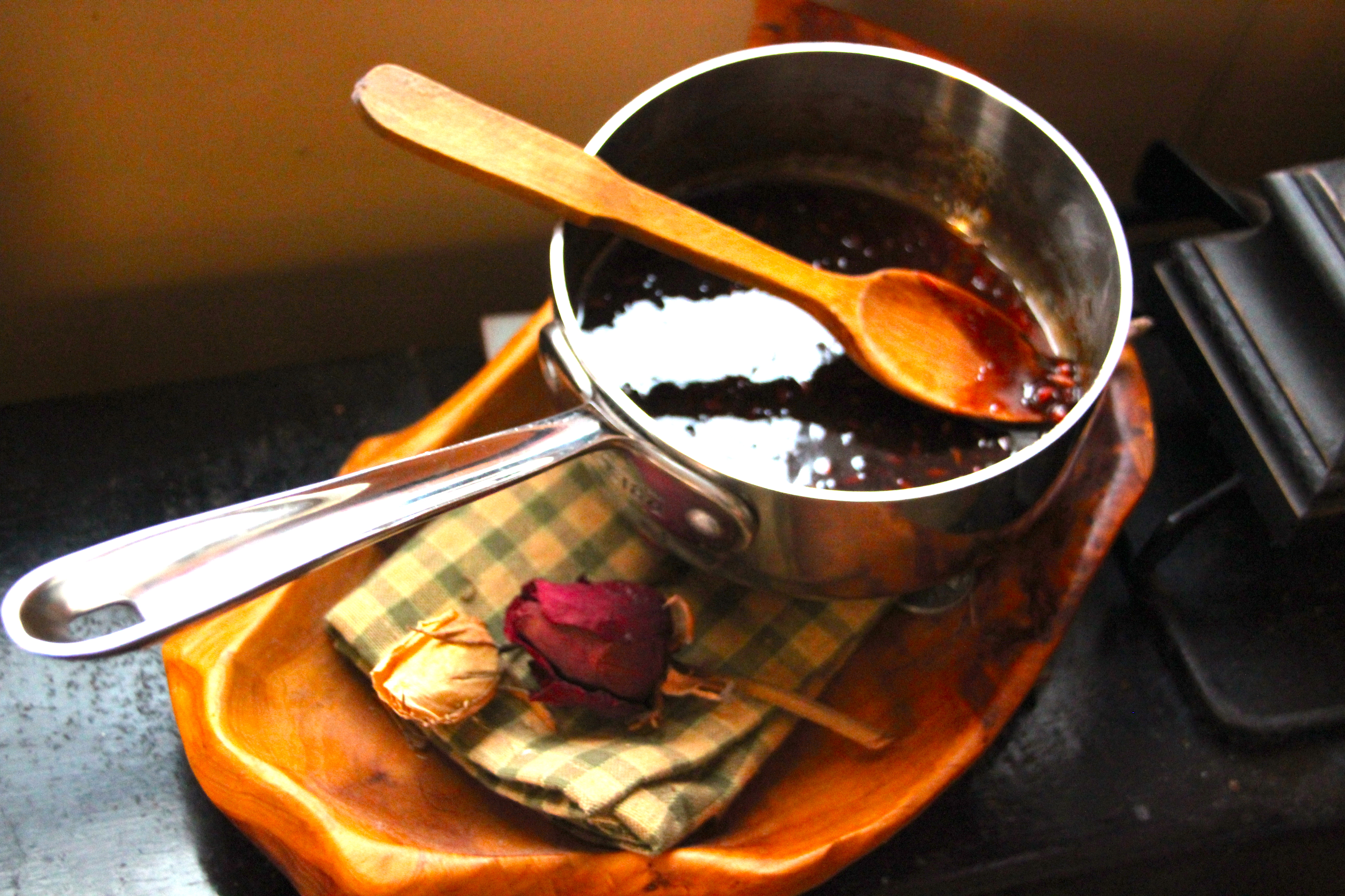 For the compote, add all three ingredients listed above for this sauce to a small saucier pan and wisk well on the lowest setting of the back right burner (smallest burner for made for this very application) about 15 minutes before the bird is to be carved. Spoon this on the carved goose to wild applause!! Bon Appetite!