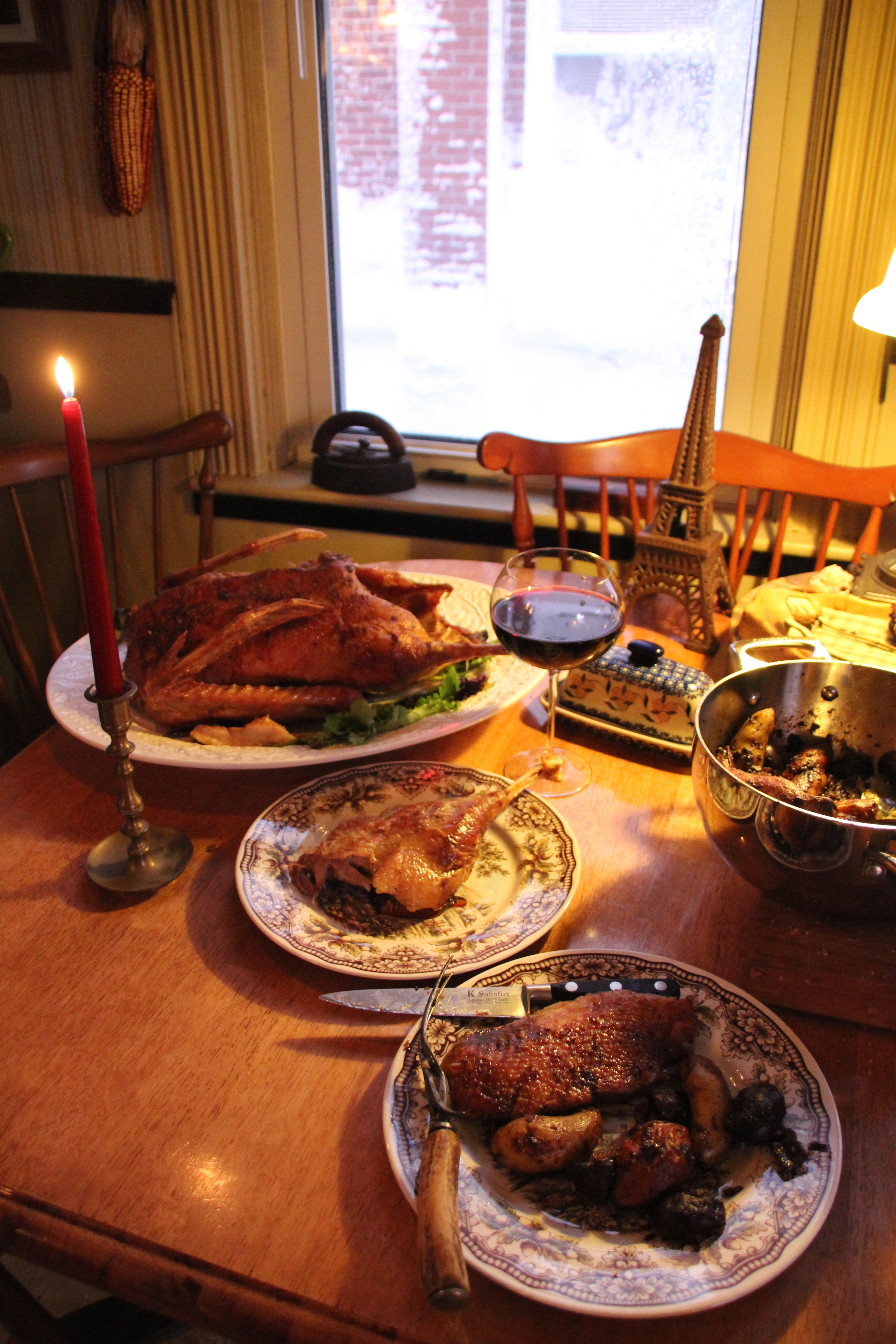 For the potatoes, place approximately 4 tablespoons of goose fat in a 4 quart covered pan that can go from stovetop to oven over a low to medium fire. When the fat has mostly melted, add the mushrooms and onions. When the onions are nicely softened, add the potatoes and cover. Cook for about 15 minutes, stirring occasionally. Add a bit of water if sticking occurs. Add one cup of burgundy wine, deglazing the bottom of the pan after fifteen minutes and place in the oven, uncovered. Stir occasionally. Add a few more tablespoons of the fat from the goose pan 3/4 of the way through cooking time and stir well. This can stay in the oven for 1 -1/2 hours so start the cooking of the potatoes half way through the cooking time of the bird.