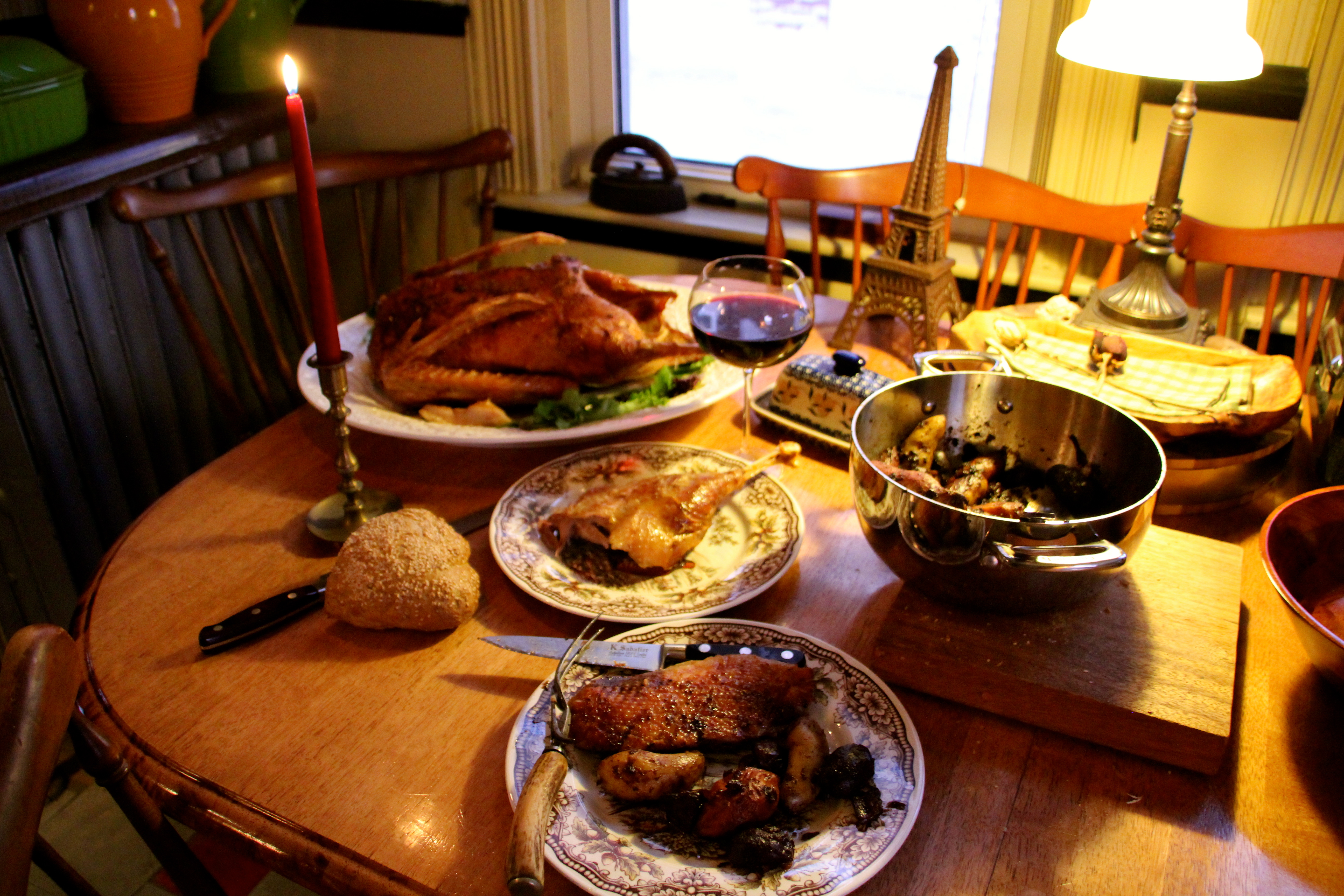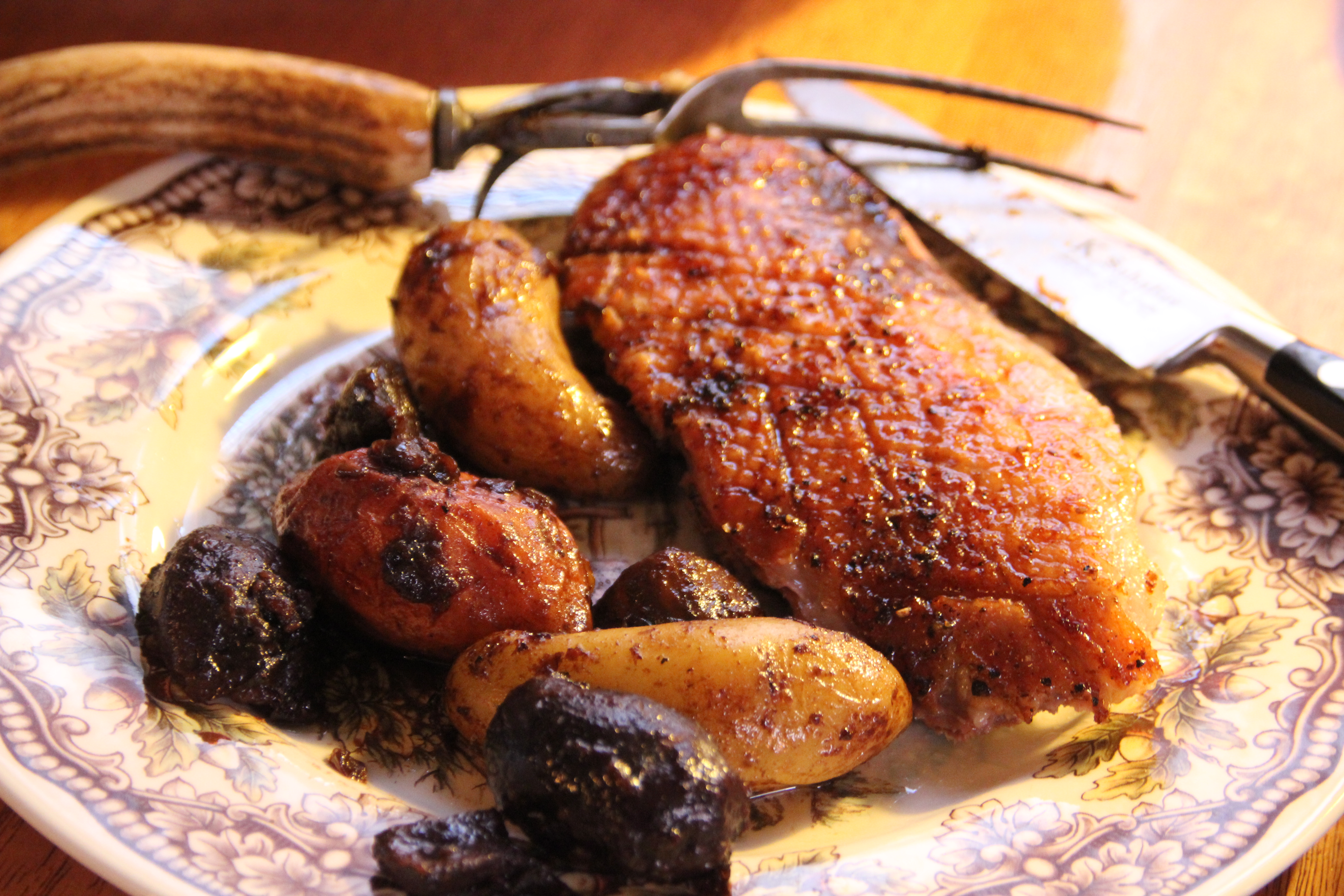 A mid-winter’s dream come true. Crispy-skinned savory roast goose is served to the delight of all with roasted fingerling potatoes and a pomegranate lime compote. This truly is a feast, and not just for the holidays. Try this wonderful and simple old French rustic preparation to the delight of your family gathered around your candlelit table…