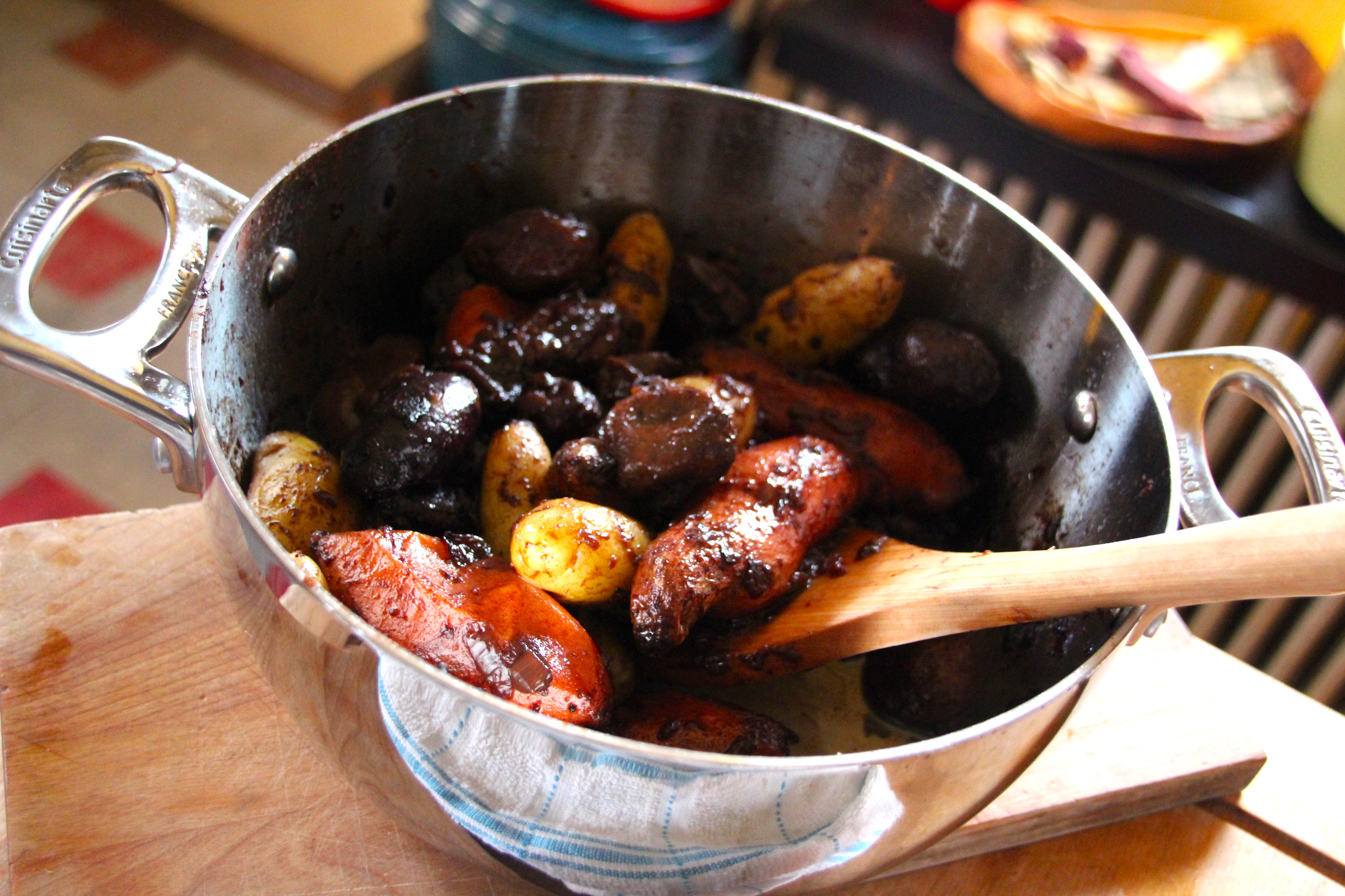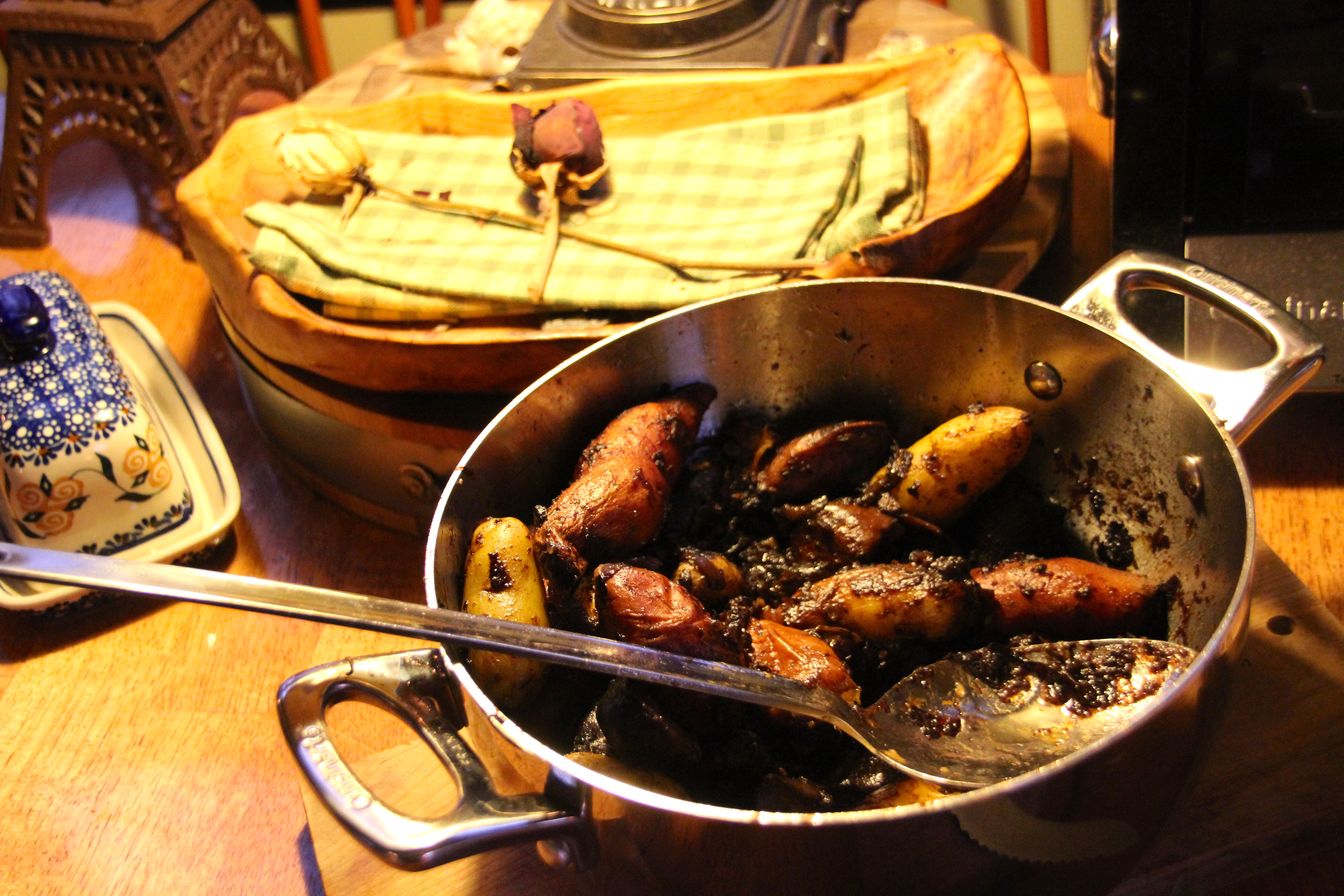 Roasted potatoes; 2 lb of fingerling or new potatoes Fat from goose 1 cup of burgundy wine 3 medium onions, sliced 1 lb of mushrooms Sea salt and fresh cracked pepper